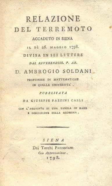 Relazione del terremoto accaduto in Siena il dì 26 maggio 1798. Divisa in sei lettere dal Reverendiss. P. Ab. D. Ambrogio Soldani Professore di Mattematiche in quella Università. Pubblicata da Giuseppe Pazzini Carli con l'aggiunta di una tavola in rame e descrizione della medesima. [Unito a]: Litogenesia. Lettera di D. Ambrogio Soldani Ab. Generale dell'Ordine Camaldolense. P. P. nell'Università di Siena. [Unito a]: Litogenesia. Lettera di D. Ambrogio Soldani Ab. Generale dell'Ordine Camaldolense. P. P. nell'Università di Siena.