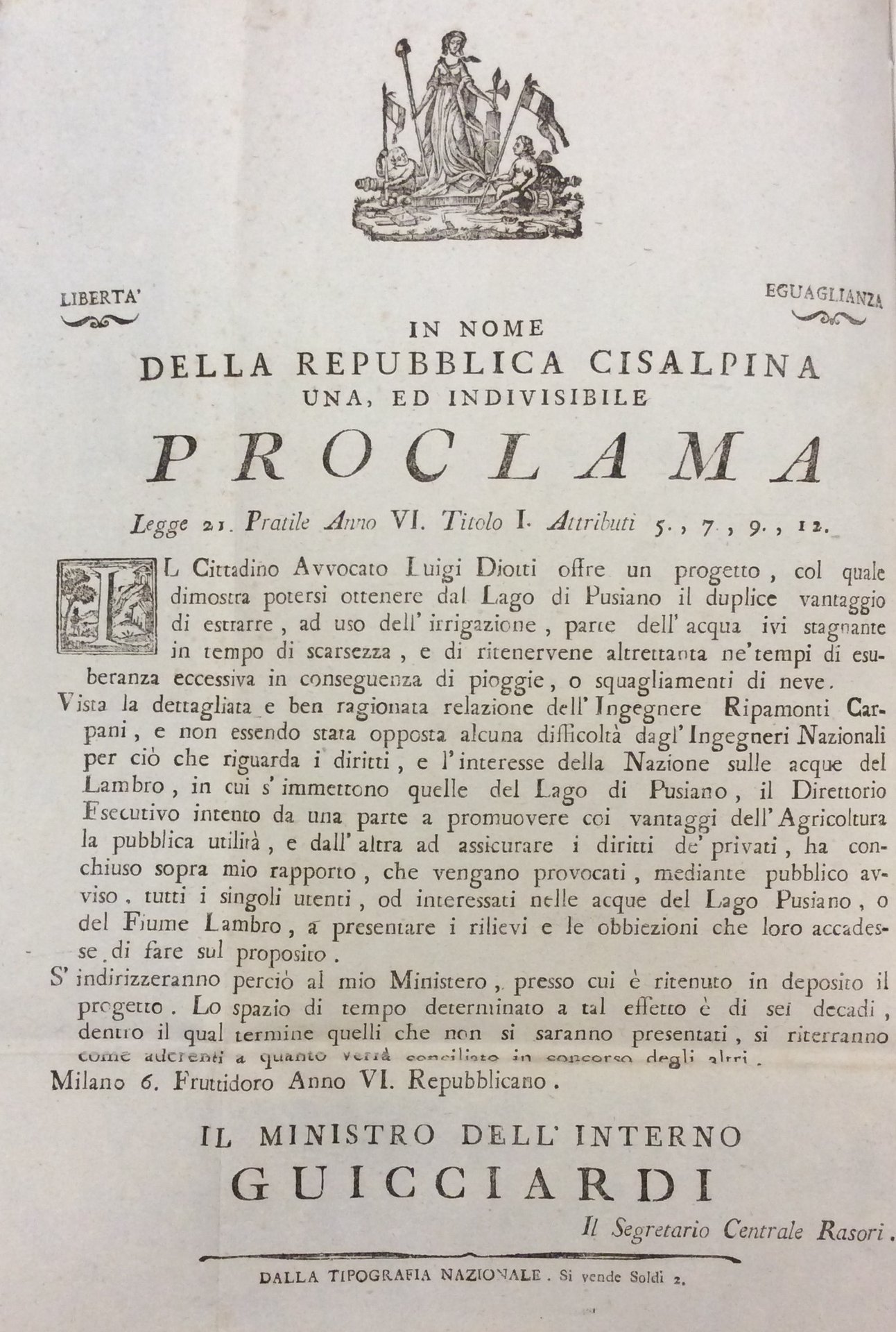 In-4 gr. (mm. 342x215), cartonato muto coevo, pp. (14) + lAllegato B, a doppia pagina, che contiene 2 inc. in rame raffiguranti il lago di Pusiano e i terreni circostanti. Vi sono contenuti: Dettaglio delle Opere ideate a farsi, e loro uso successivo - Degli effetti dattendersi, e loro uso sociale - Delluso sociale degli effetti stessi, epperò della fissazione delle cautele per conservare il qui esposto uso dei rllevati effetti delle opere progettate ed esposte nel capo I - Alleg. A: Rilievi, e Rischiarimenti su lapplicazione del Progetto Diotti al Lago di Pusiano."Edizione originale", datata Milano 15. Ottobre 1797. Lingegnere Paolo Ripamonti Carpano così dichiara nellintroduzione: Mi vedo nuovamente incaricato dal Cittadino Avvocato Diotto per una più abbondante specificazione del di lui Progetto relativo al Lago di Pusiano, su cui per di lui commissione ho già avuto a stendere altro dettaglio, chesso presentò al cessato Magistrato Camerale con suo ricorso 2. Giugno 1795.. Conviene però di presentar pure in breve lessenza di questo Progetto. Esso consiste nel trarre dal Lago naturale di Pusiano il beneficio duplice, che si cava dai Laghi artifiziali; cioè lusare nei tempi di scarsezza di parte dellacqua ivi stagnante al presente, ed il ritenere nel Catino del Lago altrettanta acqua nei tempi dincomode, ed inutili piogge, o squagliamenti di nevi... Nel 1793 allavvocato Luigi Diotti, un possidente locale, venne lidea di costruire due opere fondamentali per la protezione delle zone soggette ad inondazione ed impaludamento e nel 1795 fu affidato allingegnere Paolo Rigamonti lincarico di predisporre il progetto. La prima di queste opere, consisteva nella deviazione del tratto del Lambro a monte di Erba, chiamato appunto Lambrone, per farlo sfociare direttamente nel lago di Pusiano.La seconda, meglio nota con il nome di Cavo Diotti era la creazione di un emissario artificiale e regolato del lago di Pusiano per far fronte allestrema variabilità di portata del fiume Lambro che mal si combinava con le necessità industriali della valle. Ben conservato. Vi è unito, allinizio, il seguente Proclama, Legge 21. Pratile Anno VI. Titolo I. Attributi 5, 7, 9, 12: Il Cittadino Avvocato Luigi Diotti offre un progetto, col quale dimostra potersi ottenere dal Lago di Pusiano il duplice vantaggio di estrarre, ad uso dellirrigazione, parte dellacqua ivi stagnante.. Milano 6. Fruttidoro Anno VI. Repubblicano (23 agosto 1798).Ben conservato.