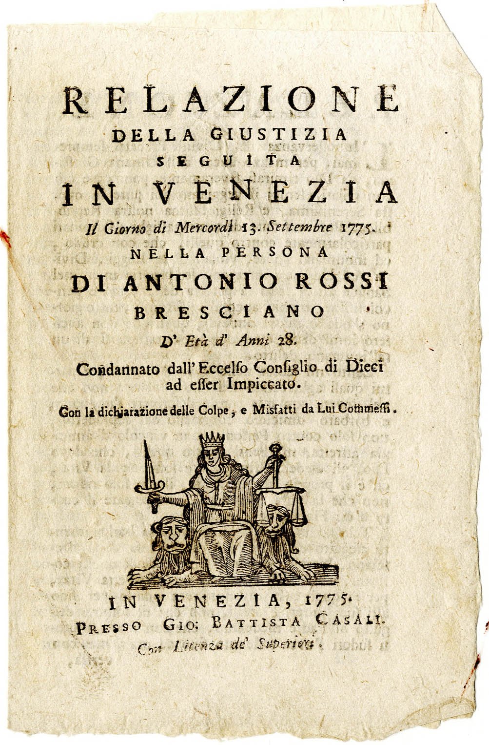 Relazione della giustizia seguita in Venezia il giorno di Mercoledi 23 Settembre 1775 nella persona di Antonio Rossi Bresciano d'età d'anni 28. Condannato dall'eccelso Consiglio di Dieci di esser impiccato. Con la dichiarazione delle Colpe e Misfatti da lui Commessi.