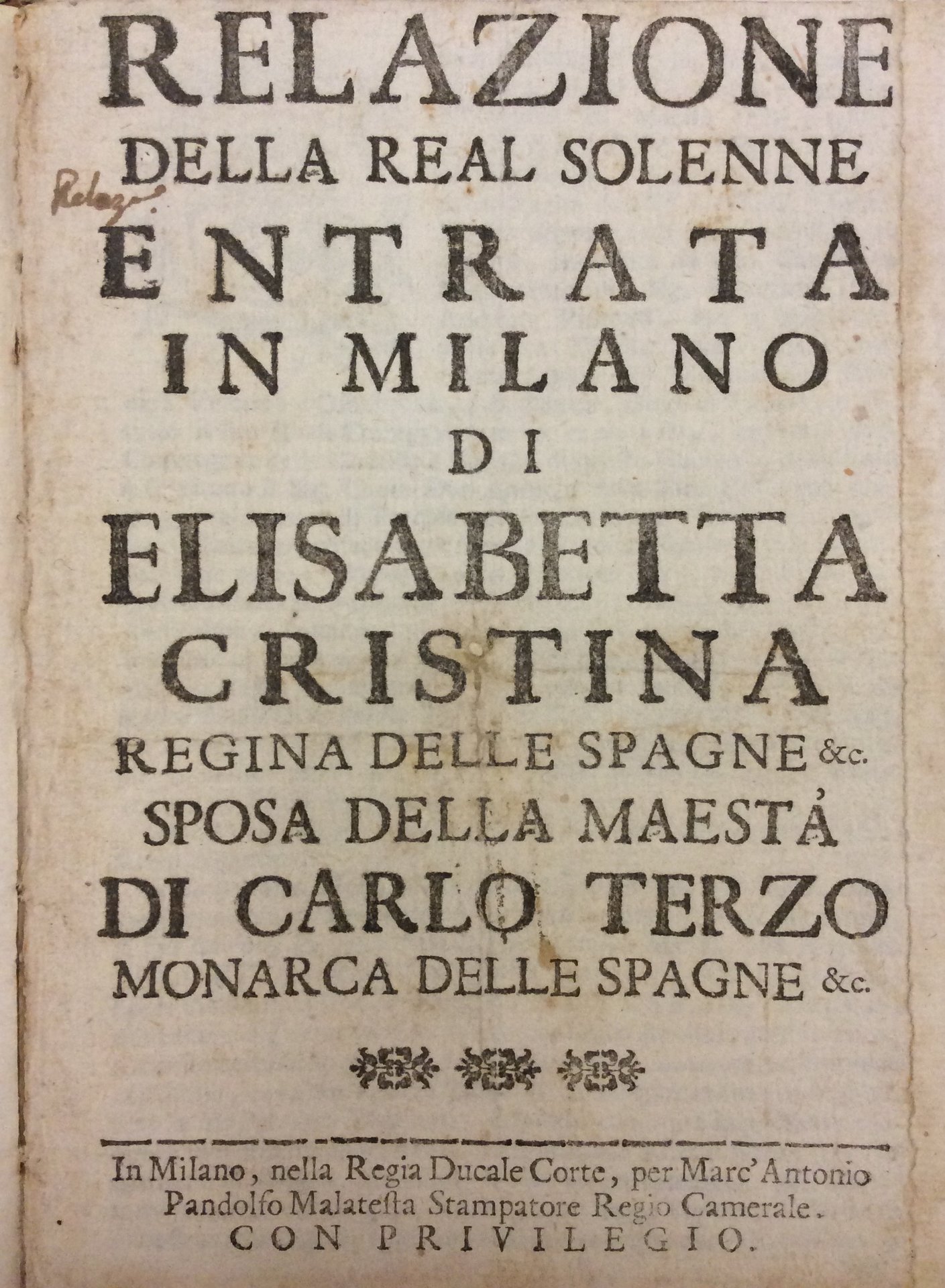 RELAZIONE DELLA REAL SOLENNE ENTRATA IN MILANO DI ELISABETTA CRISTINA REGINA DELLE SPAGNE &C. SPOSA DELLA MAESTA' DI CARLO TERZO MONARCA DELLE SPAGNE &C.