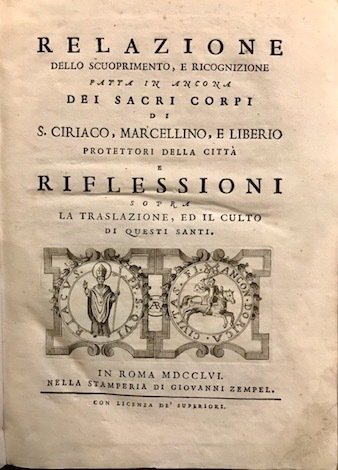 Relazione dello scuoprimento, e ricognizione fatta in Ancona dei sacri corpi di S. Ciriaco, Marcellino, e Liberio protettori della città e Riflessioni sopra la traslazione, ed il culto di questi santi