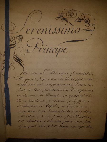 In-8 (20 cm) manoscritto 93 c. Piena Pelle. Firmato: "Marco Foscarini Cav.e e Proc.re e Ambasciador straordinario ritornato dalla parte di Torino. Ex-libris "Comes Gaschia Burgeto et Villarodino". Tagli rossi. Ampio e dettagliato resoconto dell'ambasciatore Marco Foscarini tornato dalle Corte piemontese, in cui descrive le ragioni storiche per cui i Savoia avrebbero perso interesse nell'espansione oltr'Alpi, per concentrarsi nei domini della penisola. Questo resoconto fu stampato a Torino, nel 1840, dalla Tipografia Aliana, assieme ai resoconti degli altri ambasciatori veneti: "Relazioni dello stato di Savoia negli anni 1574 1670 1743 scritte dagli ambasciadori veneti Molini Bellegno e Foscarini con note ed illustrazioni del n.u. Luigi Cibrario ." Marco Foscarini (1696-1763): nobile veneziano; erudito, scrittore, bibliotecario, diplomatico e storico. Nel 1735 fu nominato pubblico istoriografo della Repubblica e nel 1762 doge.
