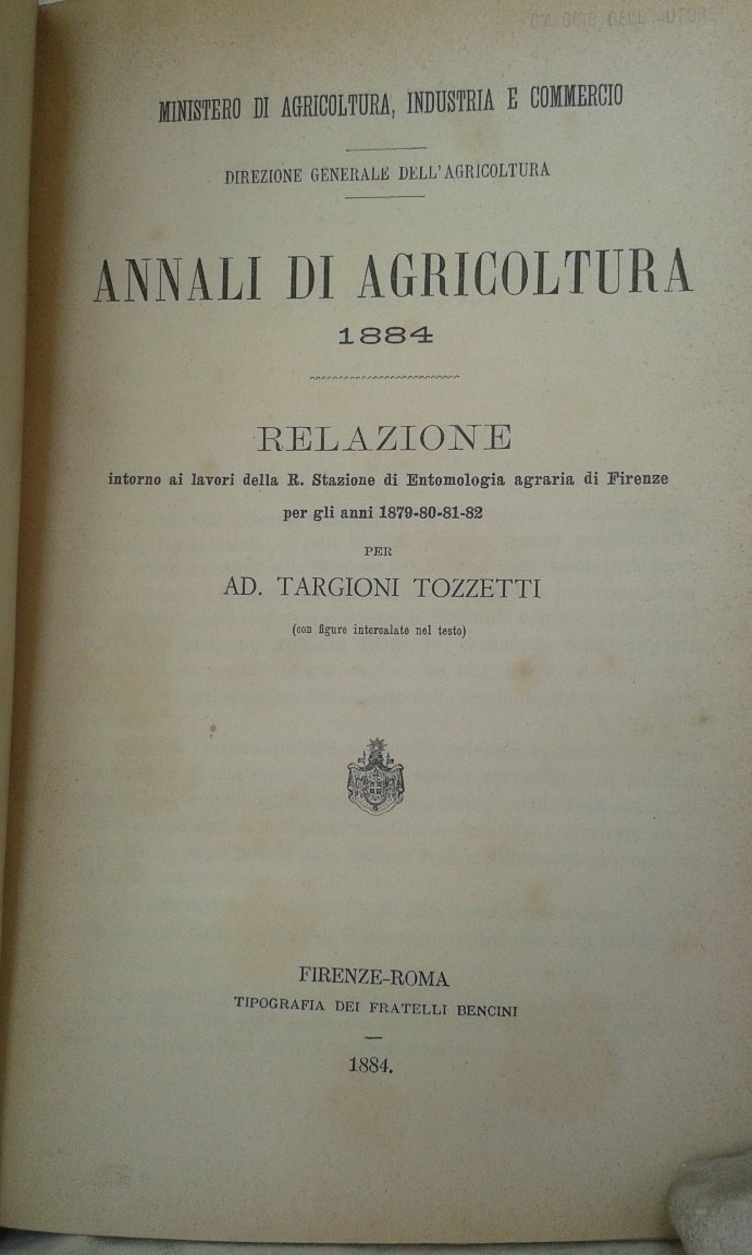 RELAZIONE INTORNO AI LAVORI DELLA R. STAZIONE DI ENTOMOLOGIA AGRARIA DI FIRENZE PER GLI ANNI 1879 - 80 - 81 - 82. Annali d'Agricoltura 1884. Direzione generale dell'Agricoltura, Ministero di Agricoltura, Industria e Commercio