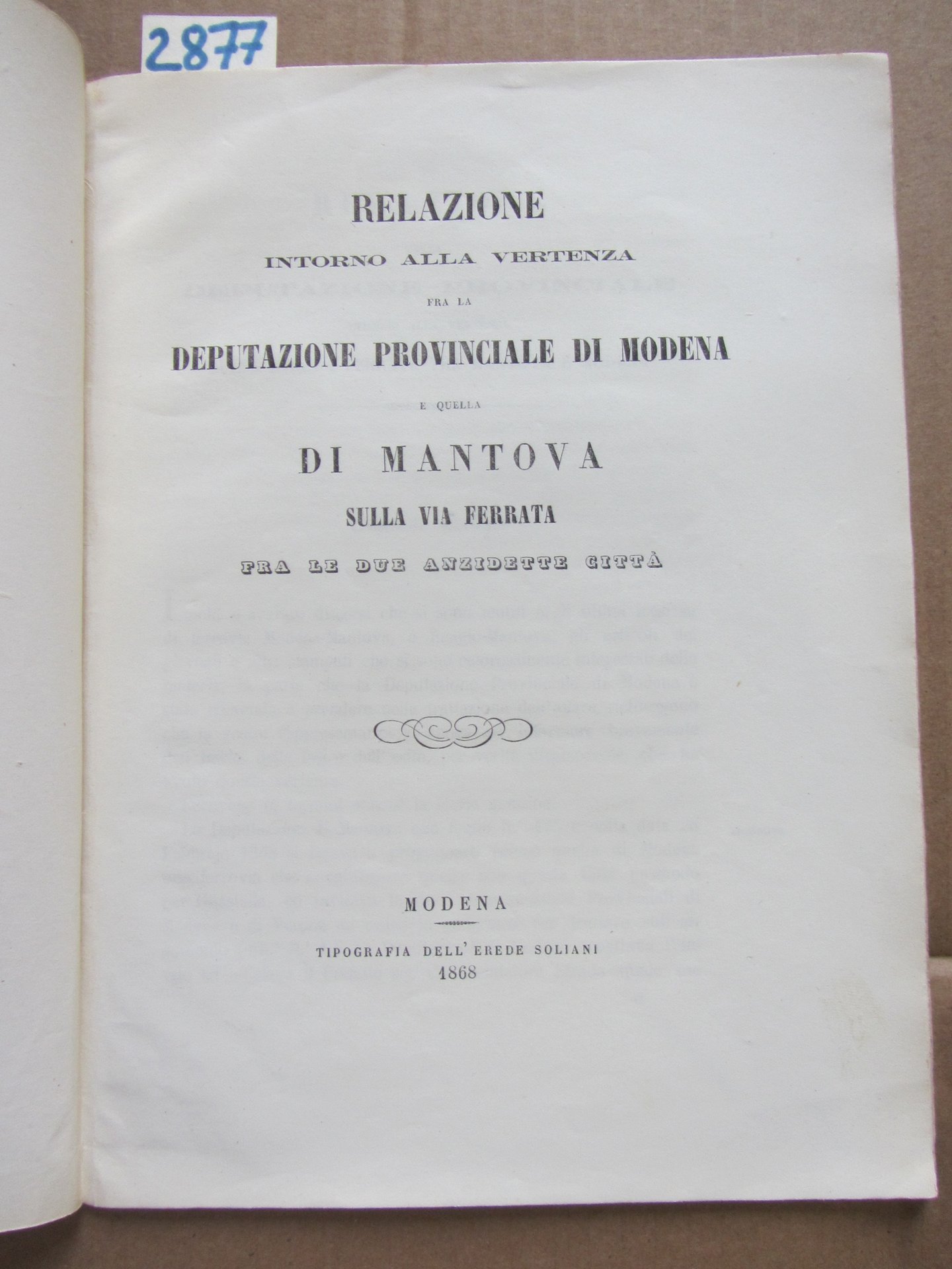 RELAZIONE INTORNO ALLA VERTENZA FRA LA DEPUTAZIONE PROVINCIALE DI MODENA E QUELLA DI MANTOVA SULLA VIA FERRATA FRA LE DUE ANZIDETTE CITTA'.
