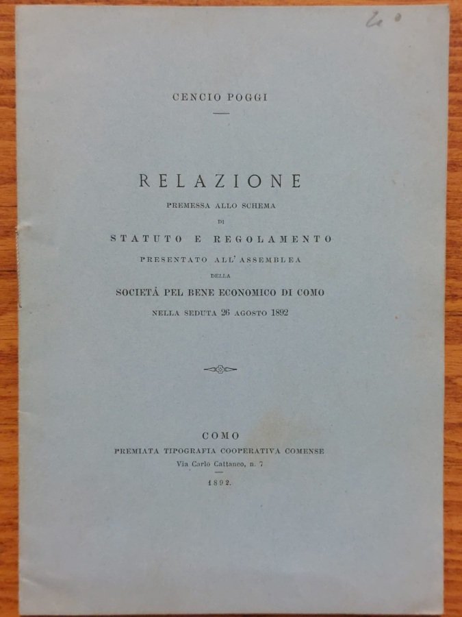 Relazione premessa allo schema di Statuto e Regolamento presentato all'assemblea della Società pel Bene Economico di Como nella seduta 26 agosto 1892.