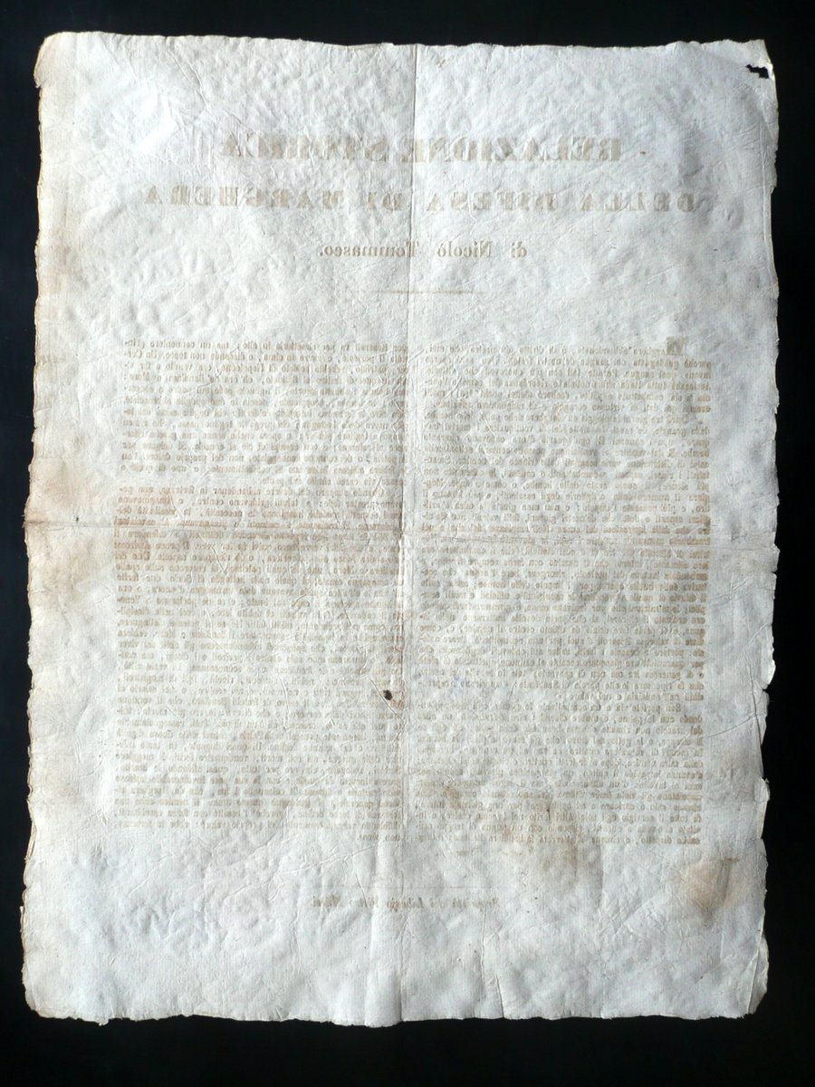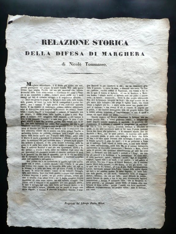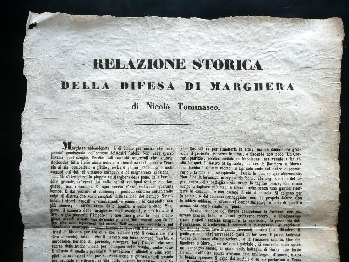 Relazione Storica della difesa di Marghera di Nicolò Tommaseo Proprietà del Librajo Pietro Milesi, s. d. (ma 1848 circa); relazione a stampa su ampio foglio in carta; testo su due colonne; margini alla forma. Cm 44x33. Condizioni di conservazione Esemplare complessivamente in buono stato con tracce d'uso, pieghe di conservazione, alcune minime tracce di vecchia umidità e qualche leggerissimo alone / gora; un margine est. lievemente ingiallito; angolo sup. sinistro con una minima mancanza. Bellissima e significativa relazione storica redatta dal Tommaseo durante la breve parentesi dell'autoproclamata Repubblica di San Marco (Venezia), nel 1848. Descrizione dell'assedio della città veneta da parte degli austriaci, di forte impronta patriottica e antiasburgica. Raro esemplare originale, di grande valore storico. SC03.D13436 N