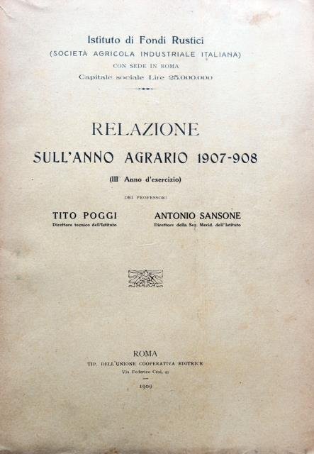 Relazione sull'anno agrario 1907 – 1908. III anno d'esercizio dei Professori Tito Poggi direttore tecnico dell'Istituto, Antonio Sansone, Direttore della Sez. Merid. dell'Istituto.