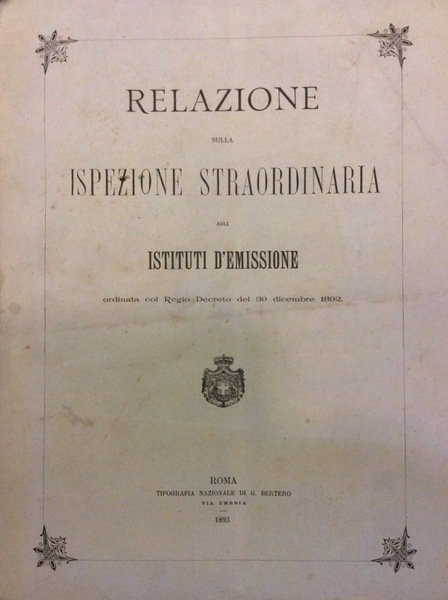RELAZIONE SULLA ISPEZIONE STRAORDINARIA AGLI ISTITUTI DI EMISSIONE. - Ordinata col Regio Decreto del 30 dicembre 1892.