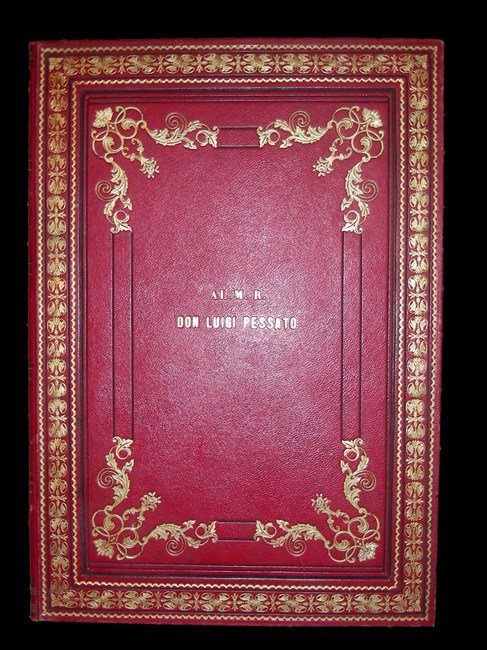 in-4, ccnn 28, splendida leg. marocchino rosso coeva con ricchi fregi e ricca bordura in oro ai piatti ant. e post., risguardi in carta color. Antip. con tit. entro ricca decorazione floreale finemente acquerellata, e front. con tit. in oro. Vi sono raccolti i discorsi e le omelie tenute dal sacerdote dall'8 Gennaio al 17 Dicembre 1882 pronunciate in diverse festività. Un doppio foglio volante manoscritto datato 21 Giugno 1885 contiene la dedicatoria. Belliss. esempl. per la legatura e l'elegante calligrafia. [365]