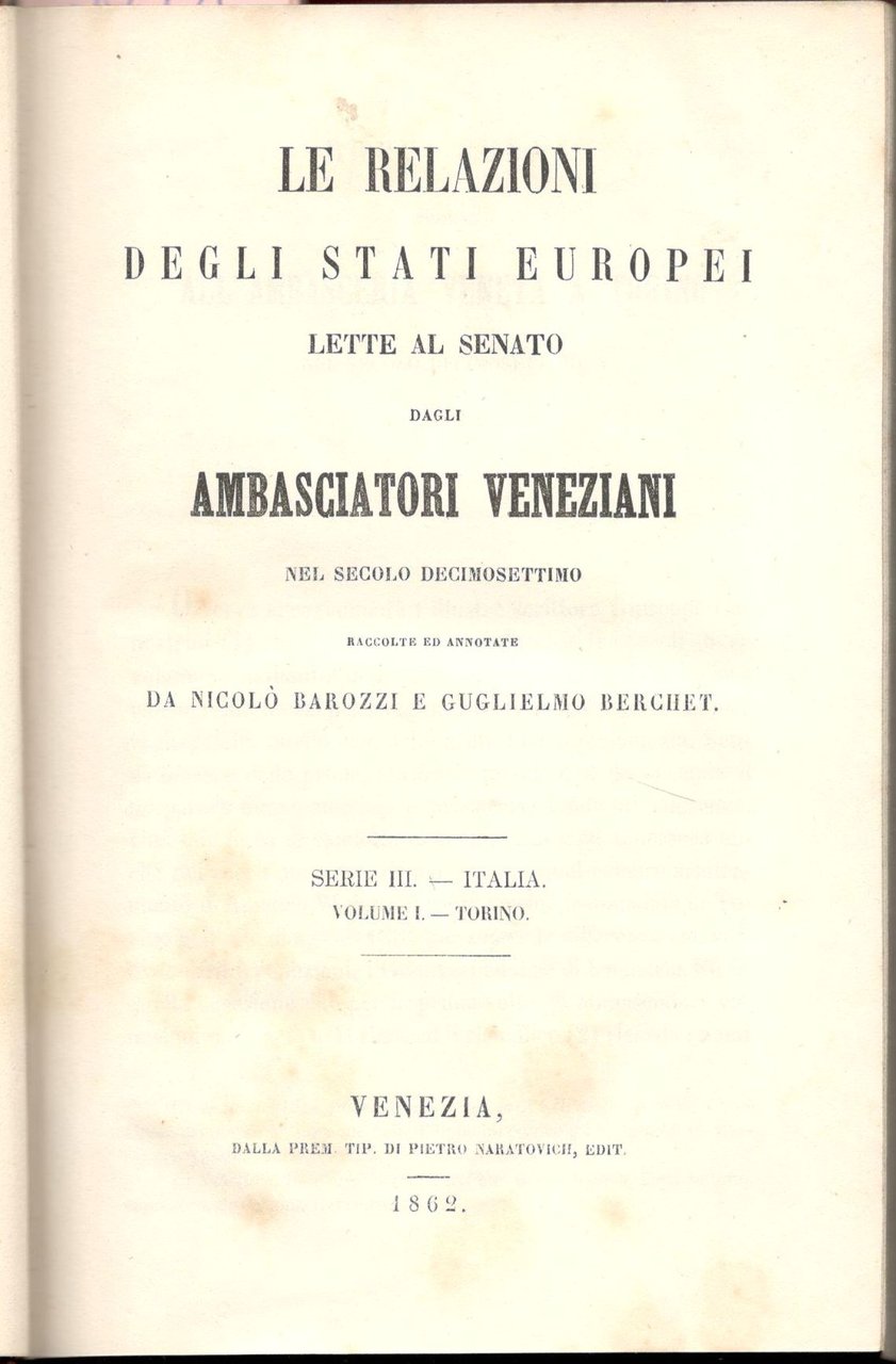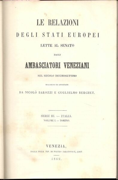 Relazioni degli Stati Europei lette al Senato dagli Ambasciatori Veneziani nel secolo decimosettimo raccolte ed annotate da Nicolò Barozzi e Guglielmo Berchet. Serie III Italia. Volume I. Torino