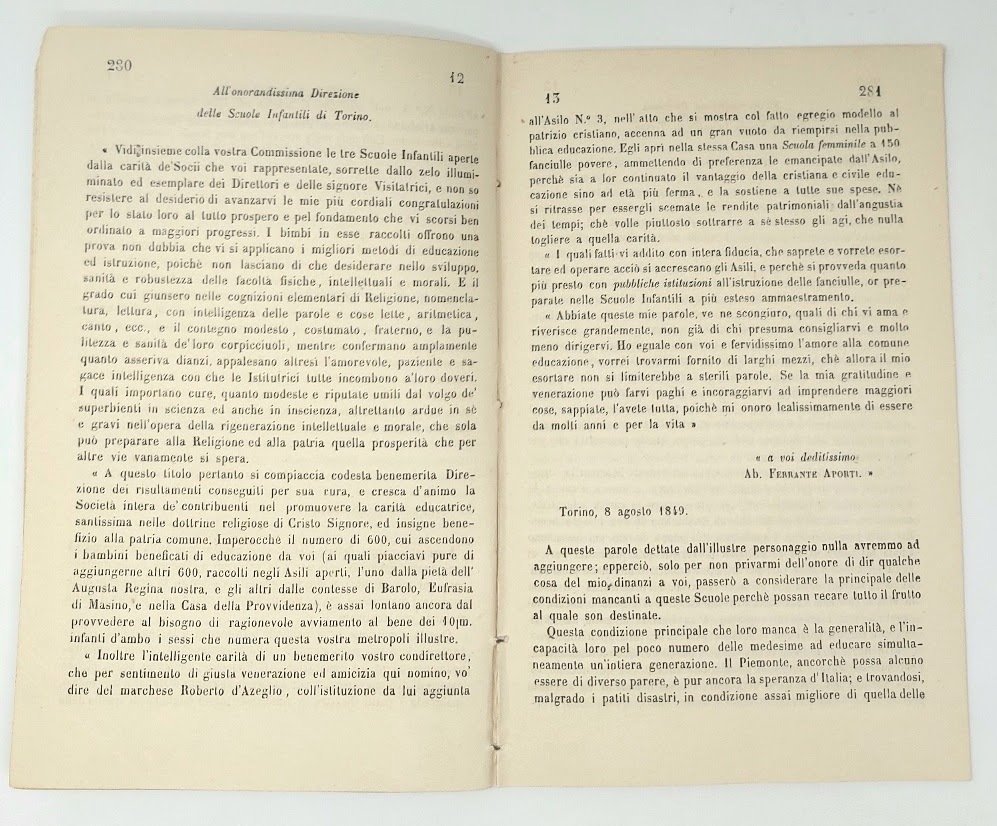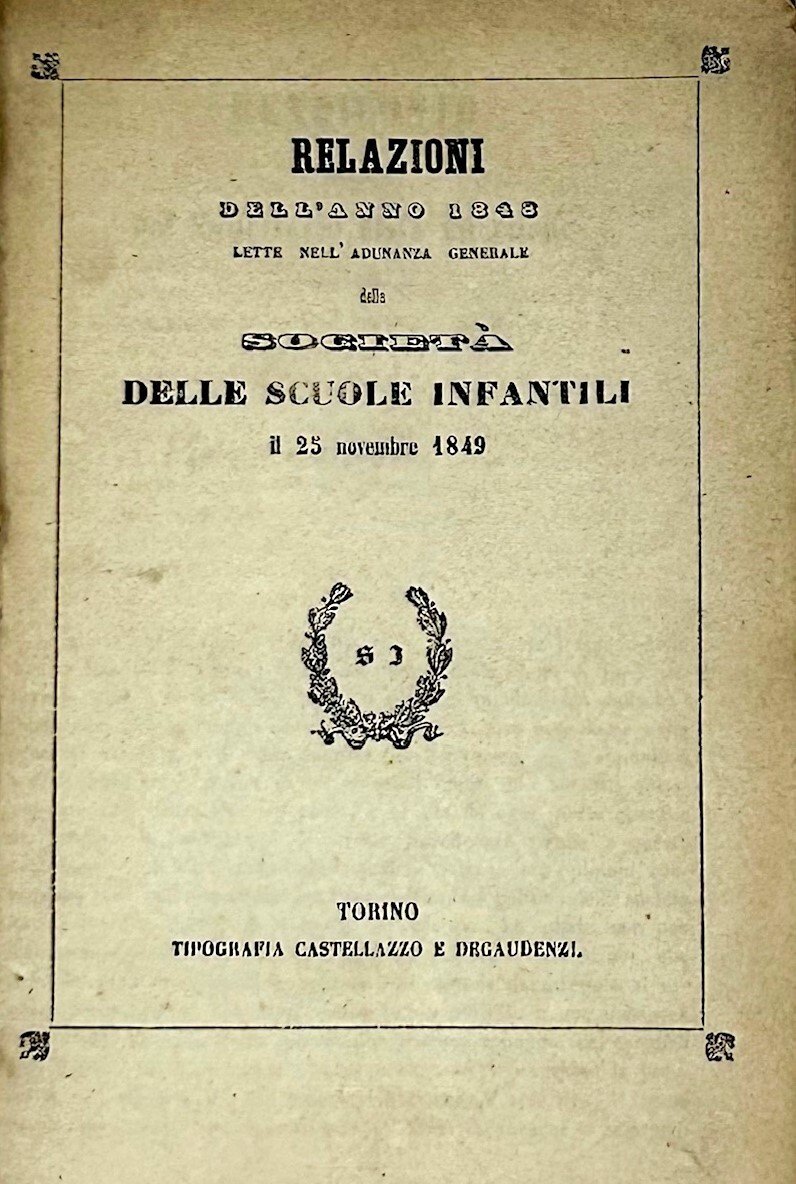 >in-8 (mm 198x125), pp. (2), 271-305. Le prime 8 pp comprendono il Rendiconto letto da Domenico Berto (segretario di Direzione). Seguono: Relazione dell'avv. Giovanni Baracco, membro della Commissione incaricata della visita alle scuole; Entrate e spese della Società nel 1848 ed in fine l'elenco degli azionisti. Nel 1848 viene istituito il Ministero della Pubblica Istruzione. La scuola viene considerata “un diritto di ogni cittadino” e viene introdotto l'obbligo scolastico. Interessante estratto dedicato alla "Società delle scuole infantili".