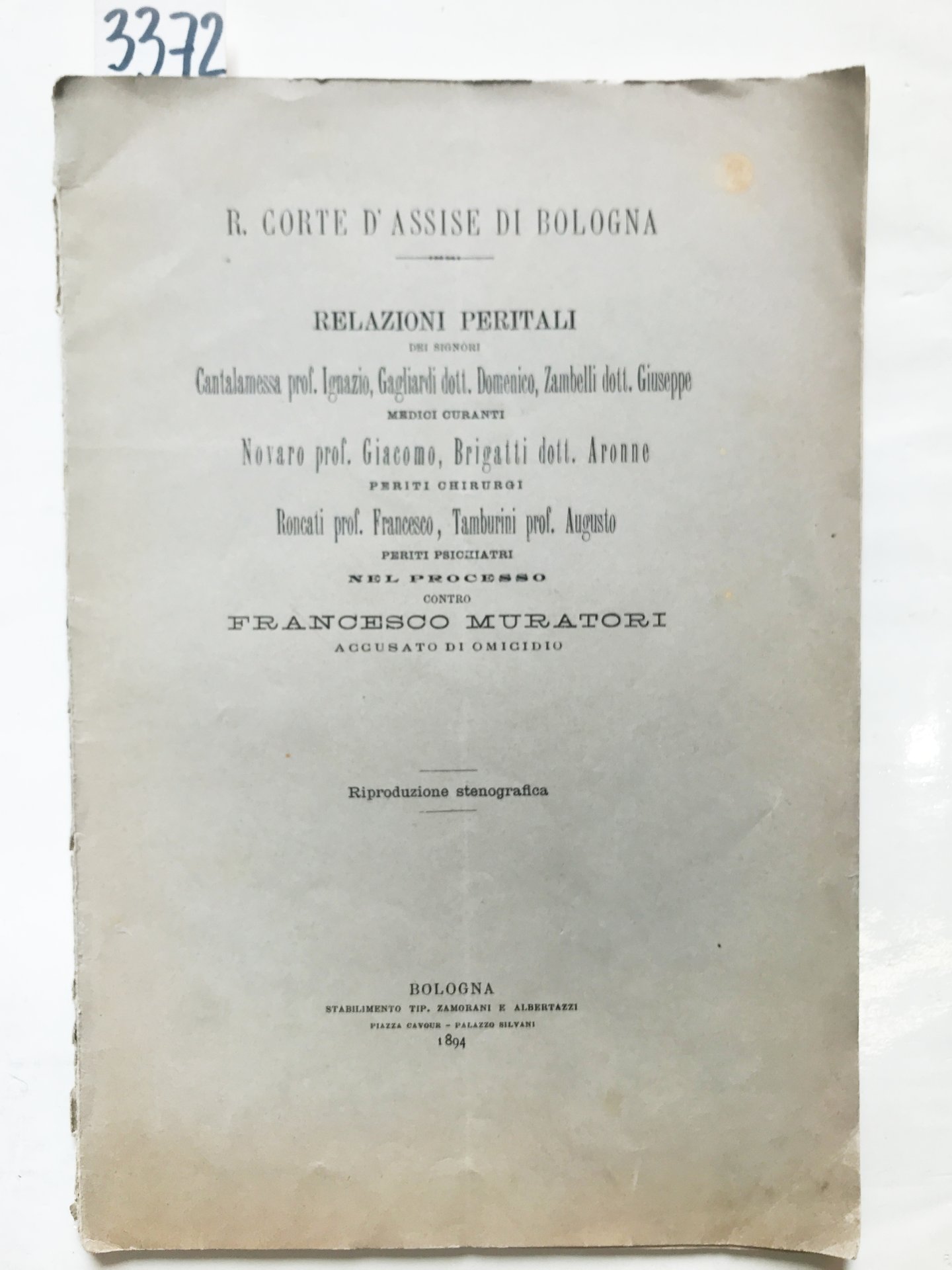 RELAZIONI PERITALI: dei signori Cantalamessa Prof. Ignazio, Gagliardi dott. Domenico, Zambelli dott. Giuseppe MEDICI CURANTI, Novaro prof. Giacomo, Brigatti dott. Aronne PERITI CHIRURGHI, Roncati prof. Francesco, Tamburini prof. Augusto PERITI PSICHIATRI, nel PROCESSO contro FRANCESCO MURATORI ACCUSATO DI OMICIDIO.