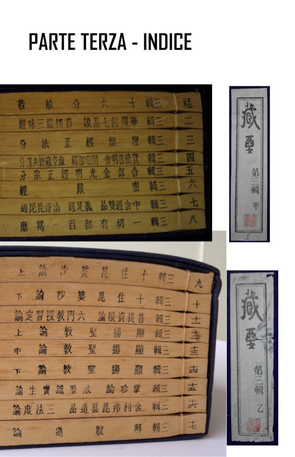 L’opera suddivisa in tre parti è raccolta in 12 caratteristiche custodie rigide in seta blu con fermaglio in osso (cm26X16,5) ed è composta da 69 libri rilegati con la tradizionale cucitura a filo. I caratteri cinesi sui tagli dei singoli libri formano gli indici.
