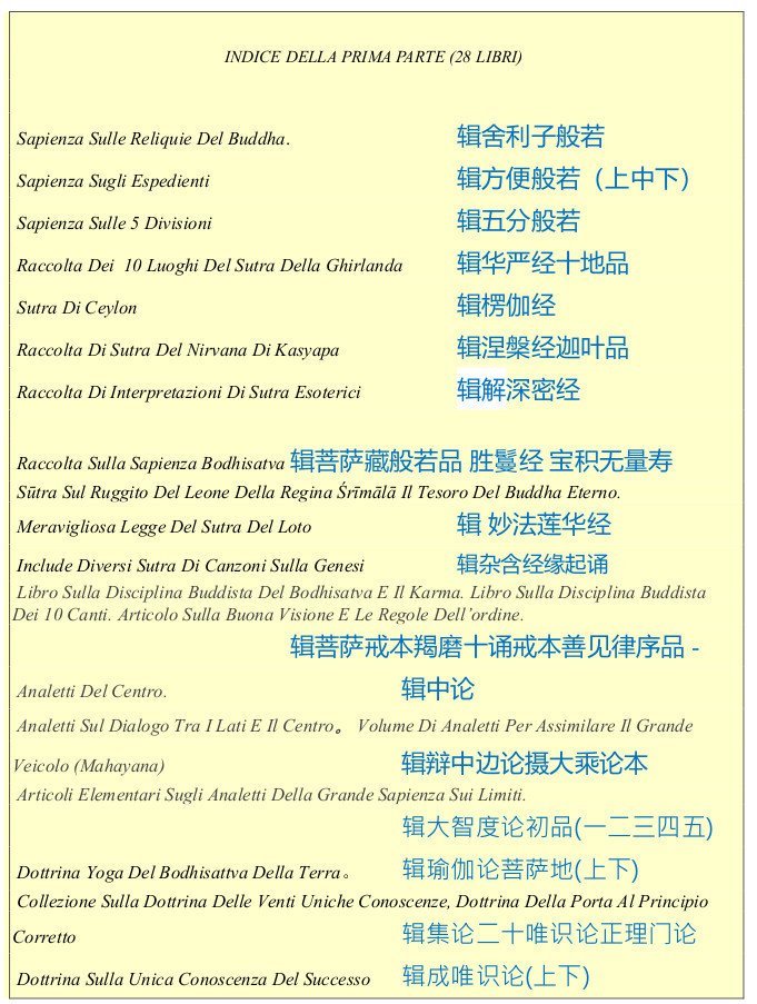 RELIQUIE DEL BUDDA - SAPIENZA SULLE CINQUE DIVISIONI - SUTRA DELLA GHIRLANDA - SUTRA DEL NIRVANA DI KASYAPA - INTERPRETAZIONI DI SUTRA ESOTERICI - SUTRA SUL RUGGITO DEL LEONE DELLA REGINA SRIMALA - LEGGE DEL SUTRA DEL LOTO - SUTRA DI CANZONI SULLA GEN