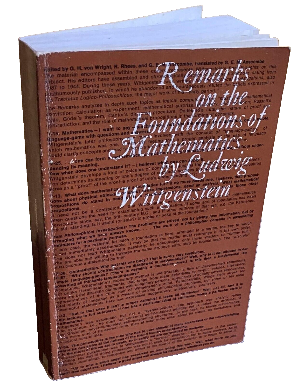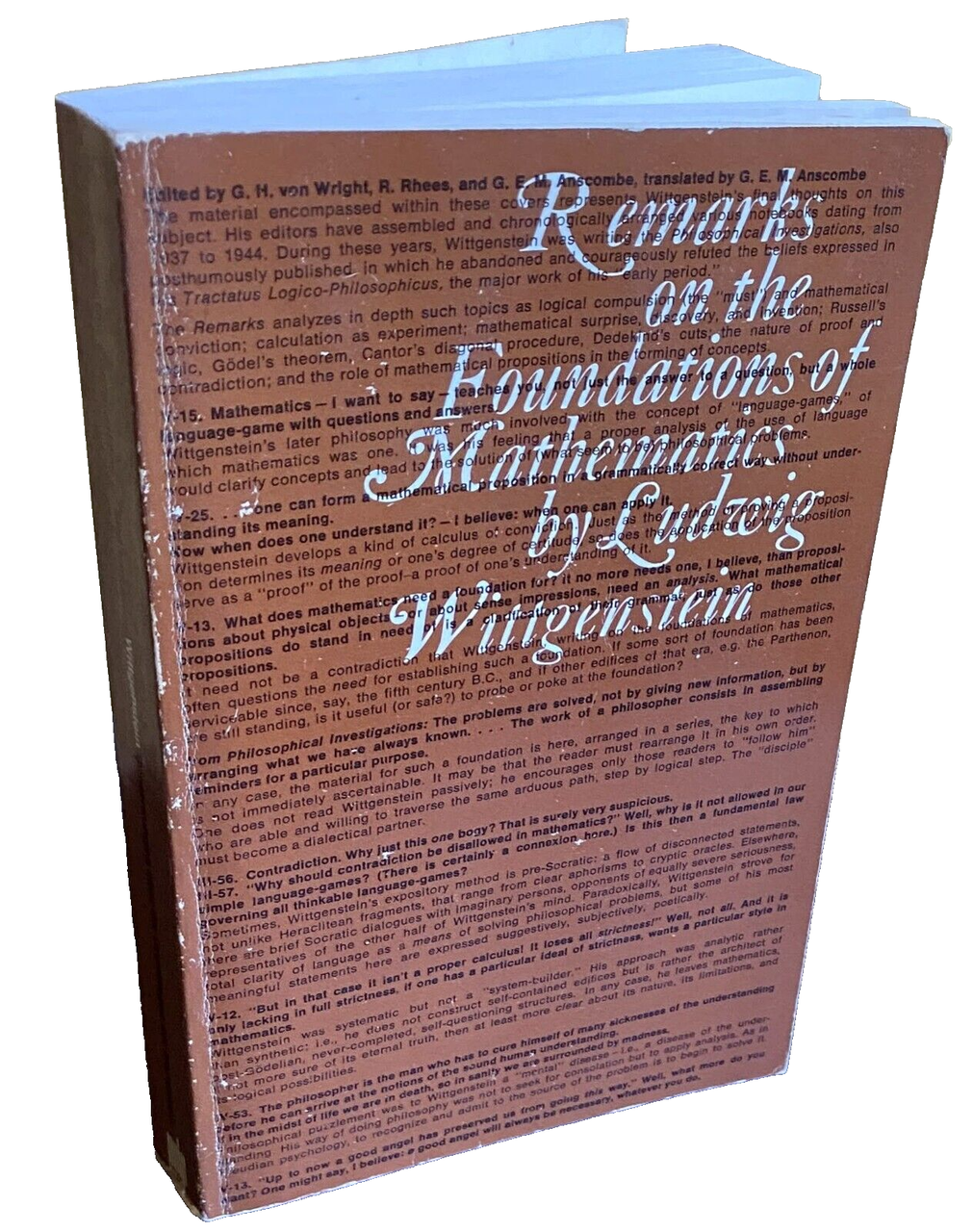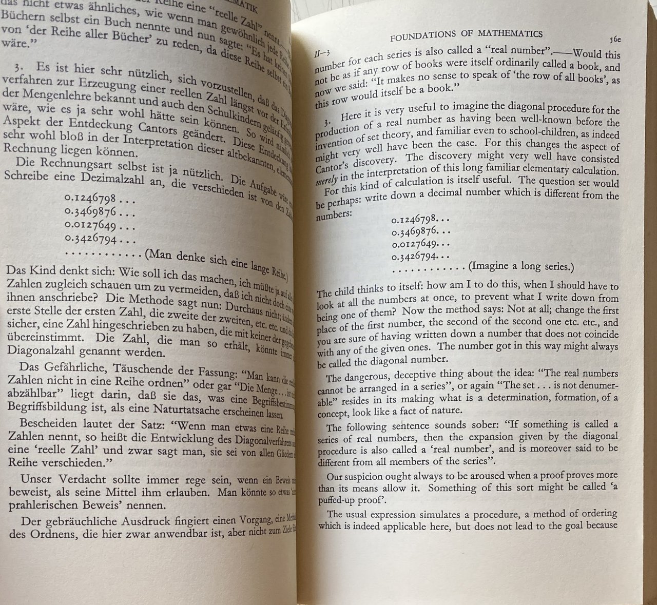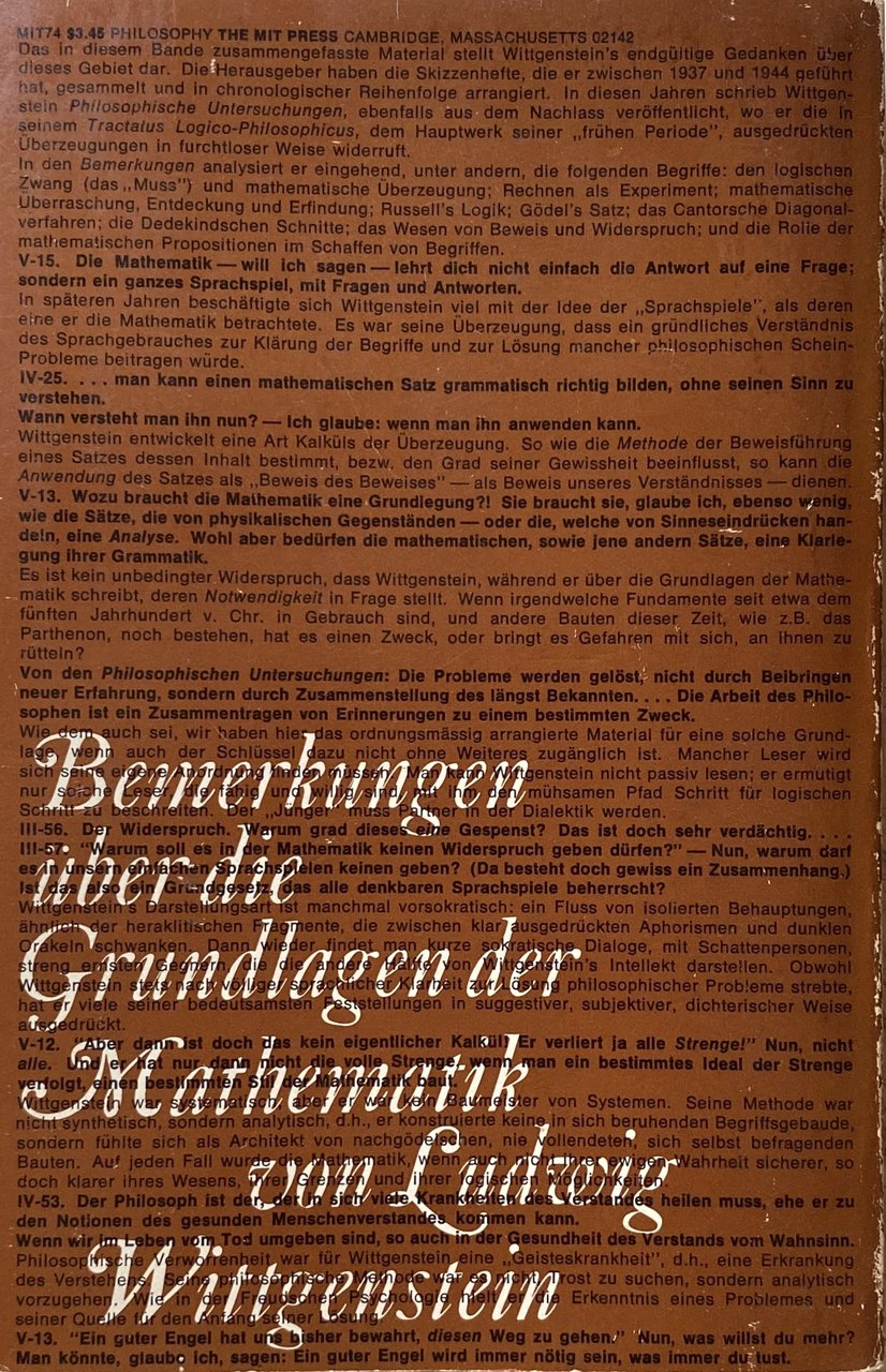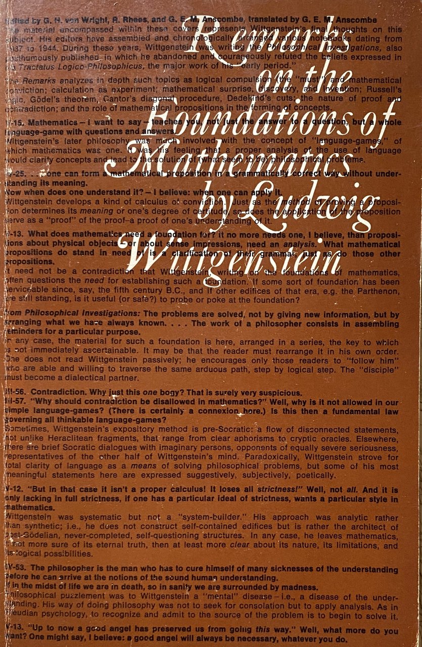 Subjects: Osservazioni sopra i fondamenti della matematica Scienza Filosofia Manuali Trattati Calcolo Logica Bertrand Russell Teorema Kurt Gödel Circolo di Vienna Tractatus Logico-Philosophicus Nachlass Teoremi Rebecca Goldstein Cantor Dedekind Dimostrazioni matematiche Contraddizione Proposizioni matematiche Concetti Linguaggio Saggi Libri Vintage rari fuori catalogo Collezionismo inglese Edizioni bilingue Tedesco Testo originale a fronte Letture Lezioni Corsi Gasking J.N. Findlay Stephen Toulmin Alan Turing Bernard Bosanquet Norman Malcolm Yorick Smythies Coerenza Sistemi formali Logicismo Frege Platonismo Negazione Verità Aritmetica Assiomi Numeri cardinali Scacchi Cerchio Poligoni costruibili Definizione Equazioni Geometria euclidea Esperimenti Espressioni Figura Formula Grundgesetze Eptacaidecagono Ettagono Idea Infinito Intuizione Leggi Pensiero Lewy Dimostrazione Media Metodo Misurazione Errore Moltiplicazione Correlazione Pentagono Pentagramma Predicato Principia Mathematica Hardy Equazione quadratica Domanda Quantica Realtà Risultato Radici Regole Quadrato Tecnica Parola Analitica Ricerche filosofiche Georg Kreisel Critica Interpretazione Finitismo Begriff Beweis Paradigma Regel Logik Zahlen Zwang Sprache Philosophie Sprachspiel Grammatica von Wright Falso Wrong Calculation Queer process Behaviorismo Relazioni Assurdo Comportamento Prova Intuizione David Pinsent Cambridge Ramsey Keynes Piero Sraffa Pascal Confessioni Sant'Agostino Lichtenberg Otto Weininger Friedrich Waismann Luitzen Brouwer Familienähnlichkeit Libro blu marrone Giochi linguistici Tatsache Paul Feyerabend Lewy Significato Tautologia Novecento Matematici Regola Costruzione Diagonale Text mirrored Science Philosophy Manuals Treatises Calculus Logic Theorem Circle Theorems Mathematical demonstrations Contradiction Propositions Concepts Language Essays Rare books out of print Collectibles Bilingual editions Original text facing Readings Lessons Courses Coherence Formal systems Logicism Platonism Negation Truth Arithmetic Axioms Cardinal numbers Chess Circle Constructible polygons Definition Equations Euclidean geometry Experiments Expressions Figure Heptacaidecagon Heptagon Infinity Intuition Laws Thought Demonstration Average Method Measurement Error Multiplication Correlation Pentagon Pentagram Predicate Quadratic equation Question Quantum Reality Result Roots Rules Square Technique Word Analytical Philosophical research Criticism Interpretation Finitism Grammar False Behaviorism Relations Absurd Behavior Arithmetic Proof Intuition Confessions Saint Augustine Book blue brown Language games Meaning Tautology Twentieth Century Mathematicians Rule Construction Diagonal
