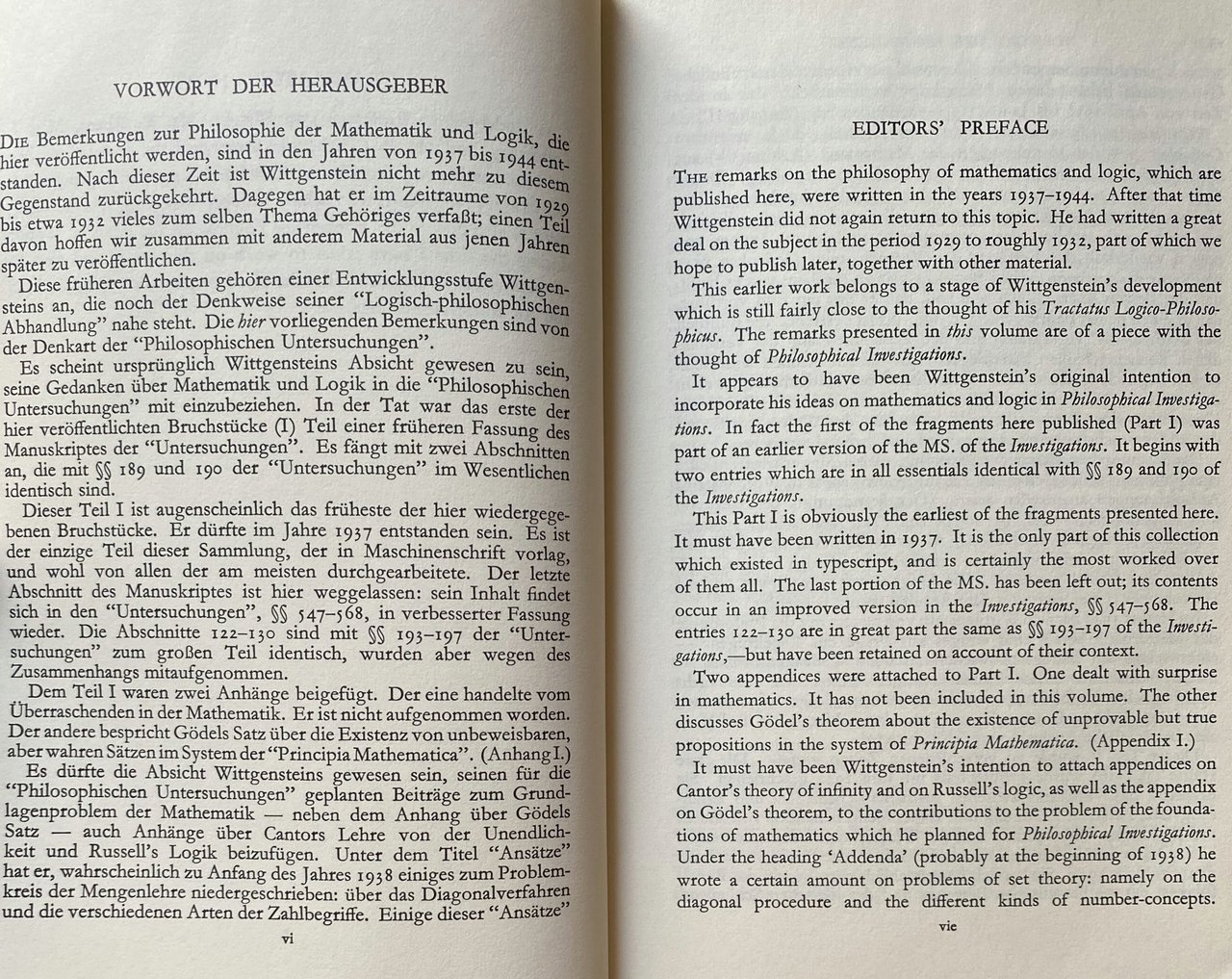 EDITORS' PREFACE. The remarks on the philosophy of mathematics and logic were written in the years 1937-1944. After that time Wittgenstein did not again return to this topic. He had written a great deal on the subject in the period 1929 to roughly 1932, part of which we hope to publish later, together with other material. This earlier work belongs to a stage of Wittgenstein's development which is still fairly close to the thought of his Tractatus Logico-Philosophicus. The remarks presented in this volume are of a piece with the thought of Philosophical Investigations. It appears to have been Wittgenstein's original intention to incorporate his ideas on mathematics and logic in Philosophical Investigations. In fact the first of the fragments here published (Part I) was part of an earlier version of the MS. of the Investigations. It begins with two entries which are in all essentials identical with 189 and 190 of the Investigations. This Part I is obviously the earliest of the fragments presented here. It must have been written in 1937. It is the only part of this collection which existed in typescript, and is certainly the most worked over of them all. The last portion of the MS. has been left out; its contents occur in an improved version in the Investigations, 547-568. The entries 122-130 are in great part the same as 193-197 of the Investigations, but have been retained on account of their context. Two appendices were attached to Part I. One dealt with surprise in mathematics. It has not been included in this volume. The other discusses Gödel's theorem about the existence of unprovable but true propositions in the system of Principia Mathematica. (Appendix I.) It must have been Wittgenstein's intention to attach appendices on Cantor's theory of infinity and on Russell's logic, as well as the appendix on Gödel's theorem, to the contributions to the problem of the foundations of mathematics which he planned for Philosophical Investigations. Under the heading Addenda (probably at the beginning of 1938) he wrote a certain amount on problems of set theory: namely on the diagonal procedure and the different kinds of number-concepts.