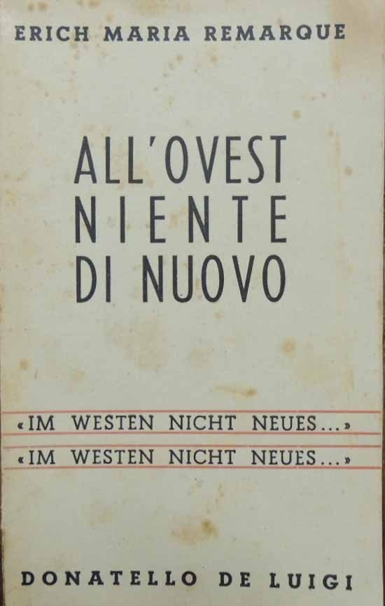 Erich Maria Remarque, All’Ovest niente di nuovo. Im westen nicht neus… im western nicht neus…, Donatello De Luigi, s.l. (ma stampato a Roma, presso la Tipografia della Società Grafica Romana) 1944, seconda ed., pp. 279, cm 20, br. ed. Collana I libri del giorno, n. 3. Traduzione di Flora Antonioni. Volume privo di sovraccoperta. Leggere tracce d’uso alla brossura, minime fioriture, ma nel complesso copia in buono stato di conservazione.