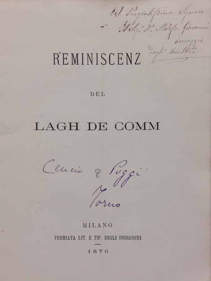 In-8º (cm. 23,1), brossura muta coeva; pp. 31, [1] in ottimo stato, con dediche ms. degli autori e firma di antico possessore al front. Sonetti lariani dedicati a Giovanni Battista De Capitani dottore alla Biblioteca di Brera, che invitava spesso i due autori nella sua villa sul lago. Ottimo esemplare. (SJ3)