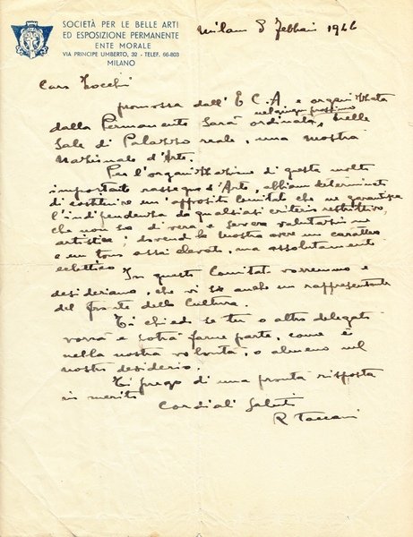 lettera manoscritta e firmata del pittore Remo Taccani di 1 facciata datata Milano, 8 Febbraio 1922 su carta intestata "Società per le Belle Arti ed Esposizione Permanente"; buon es.