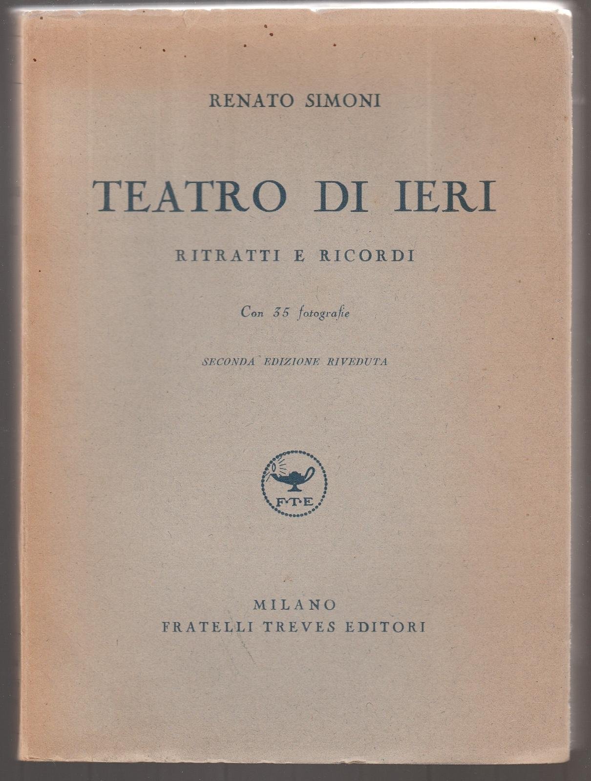 RENATO SIMONI T EATRO DI IERI RITRATTI E RICORDI 2∞ EDIZIONE TREVES 1938 L 4588 CAPITOLI DEDICATI A ELEONORA DUSE, FERRUCCIO BENINI, EMILIO ZAGO, ITALIA BENINI SAMBO, 'L'ULTIMA 'SERVETTA', EDOARDO FERRAVILLA, GAETANO SBODIO, CLETTO ARRIGHI, ERMETE NOVELLI, FLAVIO AND“, VIRGINIA REITER, VIRGILIO TALLI, TINA DI LORENZO, ORESTE CALABRESI, ALESSANDRO MOISSI, ETTOREPETROLINI, FREGOLI, ANGELO MUSCO, BRAGA, GIGI SUGANA, ROMEO CARUGATI. DUE COPIE 1∞ COPIA COPERTINA MORBIDA EDITORIALE CON PICCOLISSIMI STRAPPI AL MARGINE SUPERIORE, TAGLI IRREGOLARI LIEVISSIME FIORITURE SU ALCUNE PAGINE, IN BUONO STATO 2∞ COPIA COPERTINA EDITORIALE MORBIDA CON LIEVI MACCHIE AL PIATTO, PICCOLI STRAPPI AI MARGINI E TRA PIATTO ANTERIORE E DORSO, TRACCIA DI ETICHETTA AI PIATTI E AL DORSO, LIEVI ROTTURE AI MARGINI ESTERNI DEL DORSO, TAGLI IRREGOLARI, QUALCHE FIORITURA ALL'INTERNO IN BUONO STATO