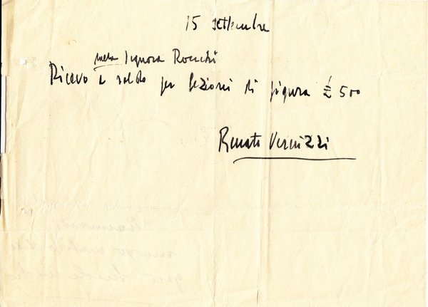 Renato Vernizzi. (Parma, 1904 – Milano, 1972). Pittore italiano. Biglietto manoscritto e firmato.