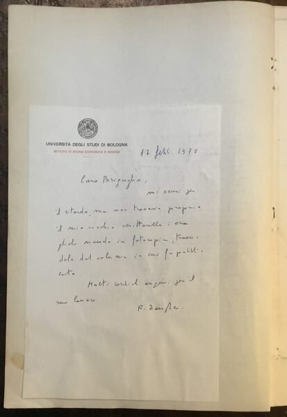 Biglietto autografo di Renato Zangheri indirizzato al Prof. Briguglio, su carta intestata Università degli studi di Bologna, datato 17 febb. 1978. Incollato ad una copia del suo scritto (‘Il Nettuno e il suo direttore Domenico Francolini’) contenuto in ‘Studi Riminesi e Bibliografici in onore di Carlo Lucchesi’ (1952)