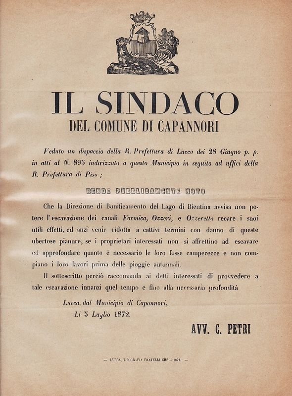 Rende pubblico e noto che la direzione di bonificamento del lago di Bientina, avvisa non potere l'escavazione dei canali Formica, Ozzeri, e Ozzeretto.