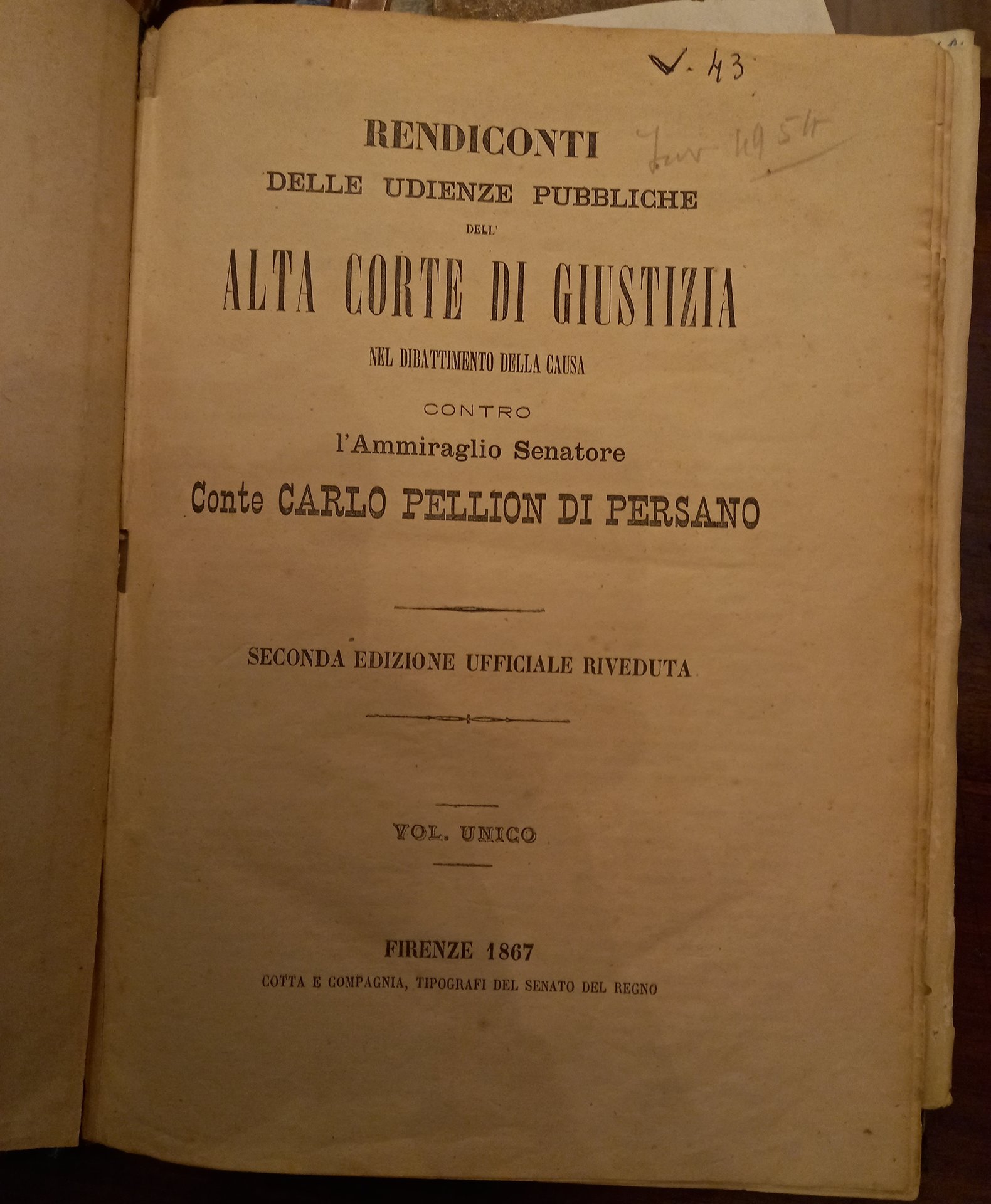 Rendiconti delle udienze pubbliche dell'Alta Corte di giustizia nel dibattimento della causa contro l'ammiraglio Carlo Pellion di Persano. Seconda edizione ufficiale riveduta. Vol unico.