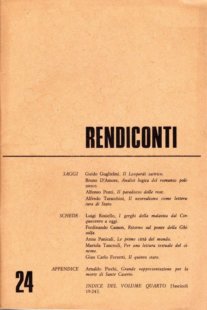 Rendiconti. Fascicolo 24. Luglio 1972, prima edizione 1972, pp. 99, formato 15 x 22.<BR>Copertina morbida di colore marrone con titoli in nero al piatto anteriore.Rivista a cura di Roberto Roversi. All'interno testi di: Guido Guglielmi, Bruno D'Amore, Alfonso Pozzi, Alfredo Tarracchini, Luigi Rosiello, Ferdinando Camon, Anna Panicali, Mariola Tancredi, Gian Carlo Ferretti e Arnaldo Picchi.<BR>Ottime condizioni.