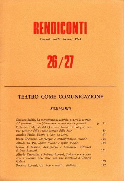 Rendiconti. Fascicolo 26/27, Gennaio 1974, prima edizione 1974, pp. 105, formato 15,5 x 22,5.<BR>Copertina morbida di colore ocra con titoli in nero e rosso al piatto anteriore. Responsabile Roberto Roversi. All'interno testi di: Giuliano Scabia, Arnaldo Picchi, Bruno D'Amore, Alfredo De Paz, Marco De Marinis, Alfredo Taracchini e Roberto Roversi. <BR>Ottime condizioni.