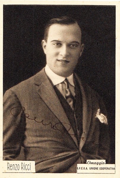 Cartoncino fotografico con autografo di Renzo Ricci Omaggio S.P.E.R.A. Unione Cooperativa; ottimo es.