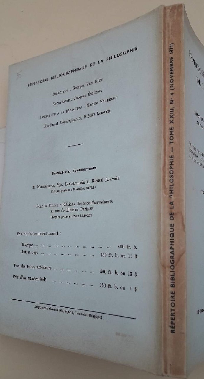 In 8', br. ed. pp. da 462 a 685, periodique trimestrel publie sous les auspices del l'Institut International de Philosophie avec le Patronage de l'UNESCA et l'Appui du Ministere de l'Education Nationale et de la Culture. Bruniture al dorso e ai margini dei piatti, interno in buono stato. ***Due to bureaucratic reasons, books dated over 70 years old cannot be immediately exported, please contact us before placing the order.***
