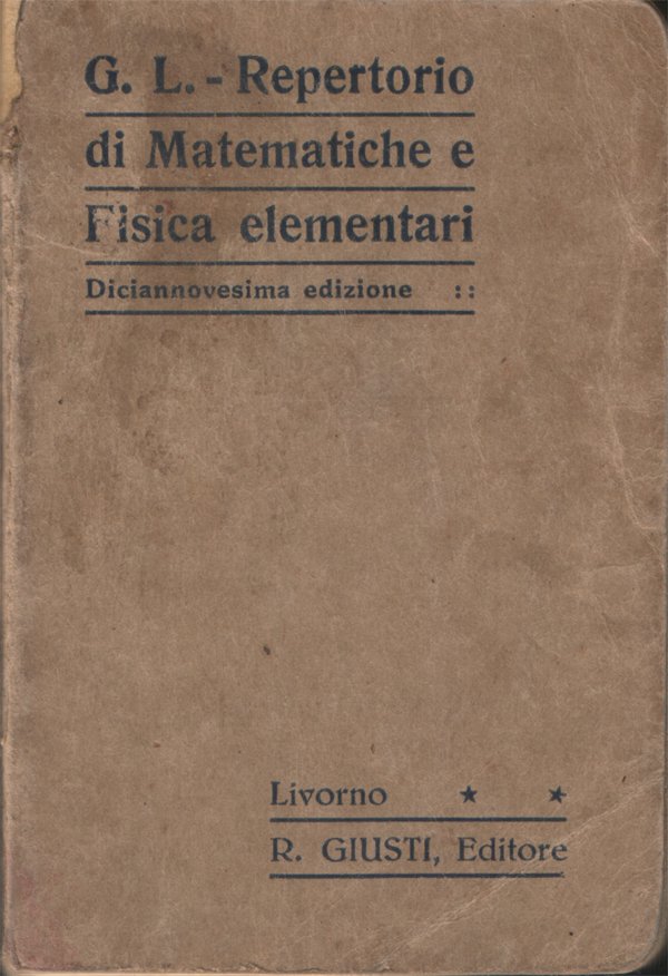 In-24°, pp. VIII, 160, copertina editoriale con segni del tempo (vedi foto) e con una piccola mancanza, reintegrata, nella parte superiore del dorso. Note manoscritte a matita alla seconda di copertina e alla guardia anteriore. Due macchie, di color marrone, non deturpanti, una nel margine sinistro di pagina 4, lontano dal testo, e una nella parte superiore di pagina 28, con parziale interessamento di due parole (testo comunque comprensibile). Indice: Matematiche. Aritmetica; Algebra; Complementi d'algebra; Geometria; Trigonometria piana; Trigonometria sferica. Fisica. Meccanica dei solidi; Meccanica dei liquidi; Meccanica dei gas; Termologia; Acustica; Ottica; Magnetismo; Elettrologia; Unità fisiche.