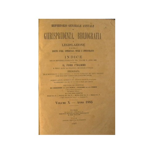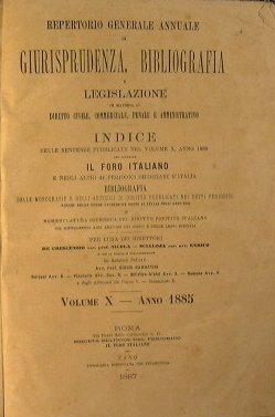 In materia di diritto civile, commerciale, penale e amministrativo. Indice delle sentenze pubblicate nel volume X, anno 1885 - Volume X Anno 1885 - in 4° - pp.1294 - Mezza pelle con titolo in oro al dorso - Lievi abrasioni alla legatura - Indice del giornale 'Il foro Italiano e negli altri 44 periodici giudiziari d'Italia. Bibliografia delle monografie e degli articoli di diritto pubblicati nei detti periodici nonché delle opere giuridiche edite in Italia nell'anno 1885 e nomenclatura giuridica del diritto positivo italiano, col riferimento agli articoli dei codici e delle leggi speciali