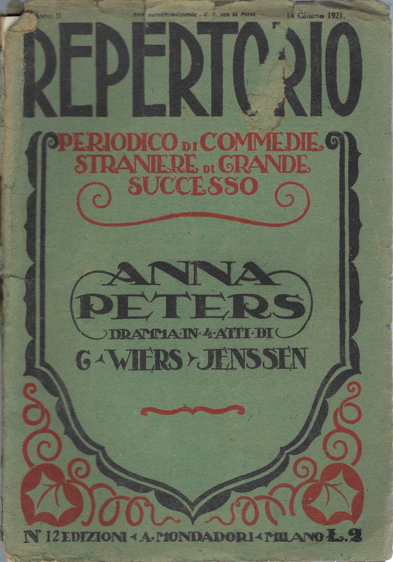 Repertorio Periodico di Commedie straniere di grande successo N ° 12 - "Anna Peters" dramma in 4 atti. Giovanni Wiers Jenssen -