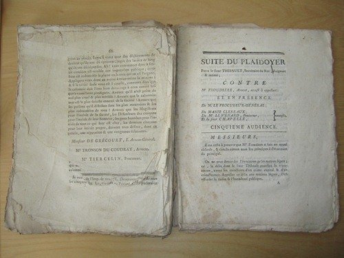 Monsieur de Grécourt Avocat-Général, Maître Tronson du Coudray Avocat, Maître Tiercelin Procureur, 1 vol. in-4 br., de l'imp. de veuve L. Dumesnil, 68 pp. et de l'Imp. de la veuve Machuel, rue S. Lo, 1788, Paris, 15 pp. Etat satisfaisant (mouill. au premier f. et mq. de papier affectant le texte au dernier ff. du premier texte, prix en l'état). On trouve dans les leçons et modèles d'éloquence judiciaire de Berryer l'exposé des faits suivants : "Marie Cléreaux, servante du Sieur Thibault, négociant à Rouen, avait été condamnée en 1788 à être pendue comme coupable de vol domestique. Me Froudière publia en sa faveur une requête judiciaire sur le vu de laquelle des lettres de surséance furent accordées par le roi à l'exécution de l'arrêt. Le parlement de Rouen réforma la sentence de mort, et renvoya l'accusée sans être condamnée ni absoute ; mais l'arrêt ordonna en même temps que la requête serait brûlée par la main du bourreau, et réserva au sieur Thibault et à la fille Delaunay sa domestique le droit d'en poursuivre l'auteur, imprimeur et distributeur. Me Froudière eut ainsi a se défendre devant le parlement de Rouen. "Le sieur Thibault n'ayant point trouvé dans sa ville natale de défenseur assez éloquent, vint à Paris prier Me Tronson Ducoudray de se charger de sa cause". Plus précisement, accusée de vol, Marie Cléreaux accusa, à l'instigation de son conseil, les frères Thibault d'avoir monté l'accusation de toute pièce, et contre-attaqua en les accusant d'avoir voulu dissimuler ainsi l'infanticide dont ils auraient étaient les auteurs. La presse s'était emparée avec délices de l'affaire et prit fait et cause pour Marie Cléreaux, rien de trop monstrueux ne pouvait alors être imaginé dans cette affaire ou deux hommes riches se trouvaient accusés par une pauvre domestique. Le frère aîné fut lynché par la foule en furie et mourut des suites de ses blessures. On s'apercevra que, douze années auparavant, Me Froudière avait usé des mêmes calomnies dans une querelle l'opposant au curé de sa paroisse. L'affaire, balayée dans les troubles de la Révolution, ne connut jamais de conclusion. Elle n'en a pas moins donnée lieue à l'un des plus remarquables témoignages d'éloquence judiciaire du XVIIIe siècle. Tronson du Coudray est célèbre pour avoir été l'avocat de Marie Antoinette. Quelque temps après ce procès, Bernard Froudière sera élu par ses concitoyens député à l'assemblée législative ; il sera l'un des témoins assignés par Louis XVI au lendemain des troubles du 20 juin 1792.