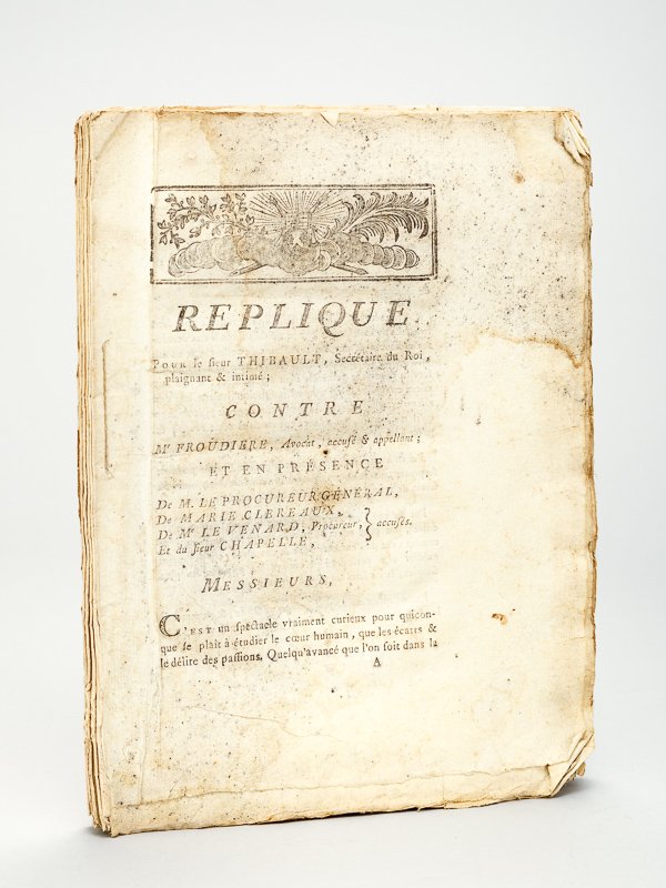 Réplique pour le Sieur Thibault , Secrétaire du Roi, plaignant & intimé contre Maître Froudière, Avocat, accusé & appellant ; et en présence de M. le Procureur Général, de Marie Clereaux, de Maître Le Venard, Procureur et du Sieur Chapelle. [ Suivi de :] Suite du Plaidoyer de Maître Thibault