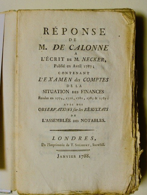 Reponse a l'écrit de M. Necker, publié en Avril 1787 ; contenant l'Examen des Comptes de la situation des Finances rendus en 1774, 1776, 1781, 1783 & 1787 ; avec des Observations sur les Résultats de l'Assemblée des Notables.