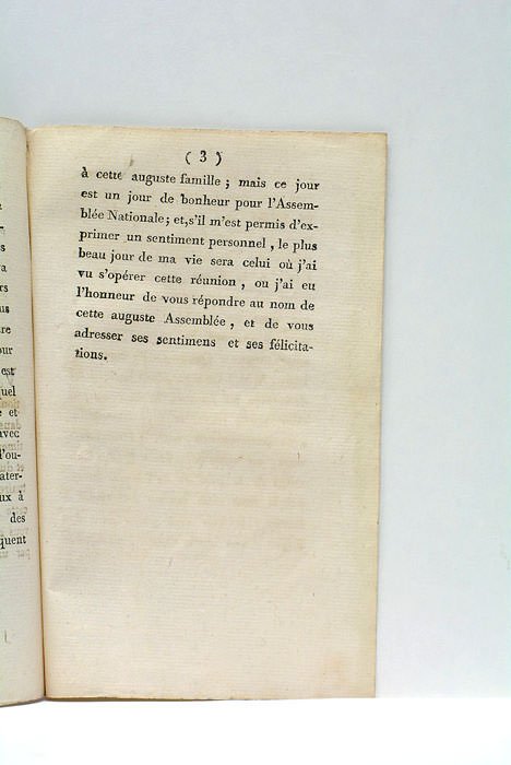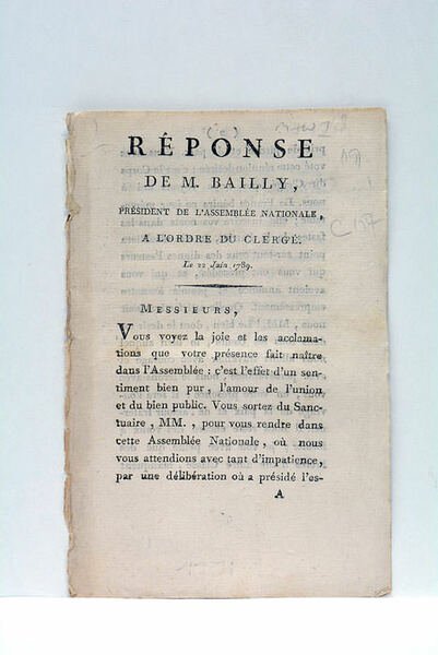 3 pages. (19x12 Cm). Broché. Papier un peu affaibli. Petite déchirure dans la marge de la dernière page. Bailly se félicite de l'entrée du Clergé dans l'Assemblée, et loue "l'amour de l'union et du bien public". Révolution.