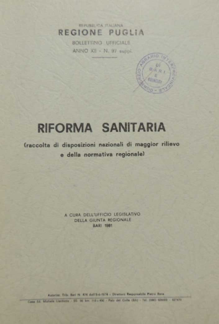 Repubblica Italiana – Regione Puglia, Riforma sanitaria. (Raccolta di disposizioni nazionali di maggior rilievo e della normativa regionale), a cura dell’Ufficio Legislativo della Giunta Regionale, s.n. (ma Casa Ed. Michele Liantonio, Palo del Colle), Bari 1981, pp. 244, cm 24, br. ed. Collana Bollettino Ufficiale, anno XII, n. 97, suppl. del 27 ottobre 1981. Timbro di bilioteca estinta alla prima di copertina e alla seconda carta di testo. Perfetto.