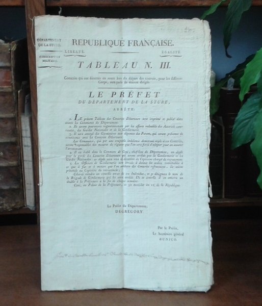 Fascicolo in folio di quattro carte, sulla prima facciata l'avviso con i codicilli (una riga scritta a pennino), sei facciate interne l'elenco dei disertori col nome dei comuni di provenienza, il Corpo d'assegnazione, la data di diserzione, nome, cognome, paternit e maternit, luoghi di nascita, domicilio, anno, altezza in metri e centimetri, caratteristiche somatiche. Sull'ultima facciata, la ricapitolazione generale per contado (od arrondissement). Documento eccezionale, sempre raro a reperirsi, in ottimo stato, notevole.