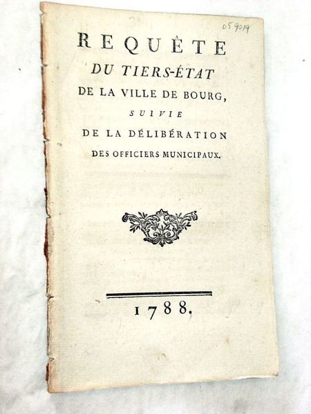 48 pages. (20x12 Cm). Dérelié. Traces de reliure au dos. Légères traces de plis. Bon exemplaire. Publiée en 1788, cette requête émane du Tiers-État de Bourg-en-Bresse, dans le contexte pré-révolutionnaire français. À l'aube de la Révolution Française, cet écrit reflète les tensions et les aspirations à une réforme profonde de la société. À travers cette demande, adressée dans le cadre de la convocation des États-Généraux, les officiers municipaux de Bourg-en-Bresse expriment les doléances et les espoirs d'une population en quête d'équité et de justice.