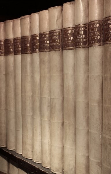 Prima edizione, rara a trovarsi così completa anche dei volumi di supplemento, del celeberrimo, monumentale lavoro di Lodovico Antonio Muratori (Vignola 1672 - Modena 1750), che costituisce la prima grande raccolta di fonti medievali della storiografia moderna e la base della storiografia italiana. Si tratta di una raccolta critica di cronache e di storie dal 500 d.C. al 1600, tratte per lo più da manoscritti pazientemente studiati e confrontati, scelte e curate, in lunghi anni di lavoro, con dottrina incomparabile. L'opera fu pubblicata sotto gli auspici di una società di dotti espressamente costituitasi a Milano, la Tipografia Palatina, presieduta dal Trivulzio e posseduta per metà dall’Argelati. Nel ‘corpus’ muratoriano figurano i cronisti Giordane, Procopio, Paolo Diacono; sono edite preziose fonti documentarie, come le Leggi longobarde, i Capitolari carolini, il ‘Liber pontificalis’, quello di Agnello Ravennate, la vita della Contessa Matilde, gli annali e le cronache monastiche di Farfa, della Novalesa, di San Benedetto di Montecassino, di Subiaco, le prime storie delle Puglie, della Calabria, della Sicilia, come quelle di Romualdo Salernitano, Saba Malaspina, Niccolò de Iamsilla, le preziose cronache degli Svevi e quelle piu' importanti regionali dei secoli XIII-XIV, fra cui quelle di Dino Compagni e dei Villani.
