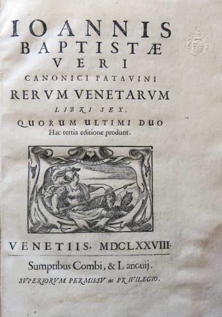 Sumptibus Combi, & Lanouij. Venetiis, 1678. In 4to, frontespizio con grande marca incisa, recante motto "La Minerva" e raffigurante un guerriero disteso in riposo, pp. (14) con la Dedica al Serenissimo Principi Aloysio Contareno Venetiarum Duci, l'Avvertenza al Lettore, l'Indice, l'Errata Corrige), 521, testate e grandi capilettera incisi, testo a grandi caratteri, bross. muta in cartonato alla rustica. Il padovano Vero fu per alcuni anni segretario del Cardinale Barberini a Roma, città che abbandonò precipitosamente perché sospettato di essere l'ispiratore di alcune pasquinate. Rientrato in Veneto scrisse questa storia che va dal 536 al 1669; stando al “Foscarini (pag. 250), è la più esatta di tutte, sebbene compendiosamente scritta; sicché quest'autore potrebbe essere reputato il Floro della istoria Veneziana” (Cicognara, pp. 602 e 608, edizione originale del 1638 dei primi 4 libri). La prima edizione dell'opera è Venezia, 1638; la seconda è L. Elzevirium, Amsterdam, 1644, che conobbe anche traduzione in italiano; una successiva è quella di Padova, Tipografia del Seminario, 1684. Alcune tracce del tempo alla brossura, peraltro esemplare ben stampato, a larghi margini e in ottimo stato di conservazione.