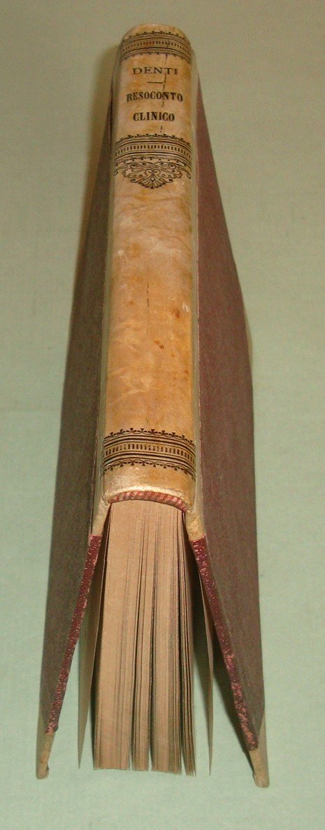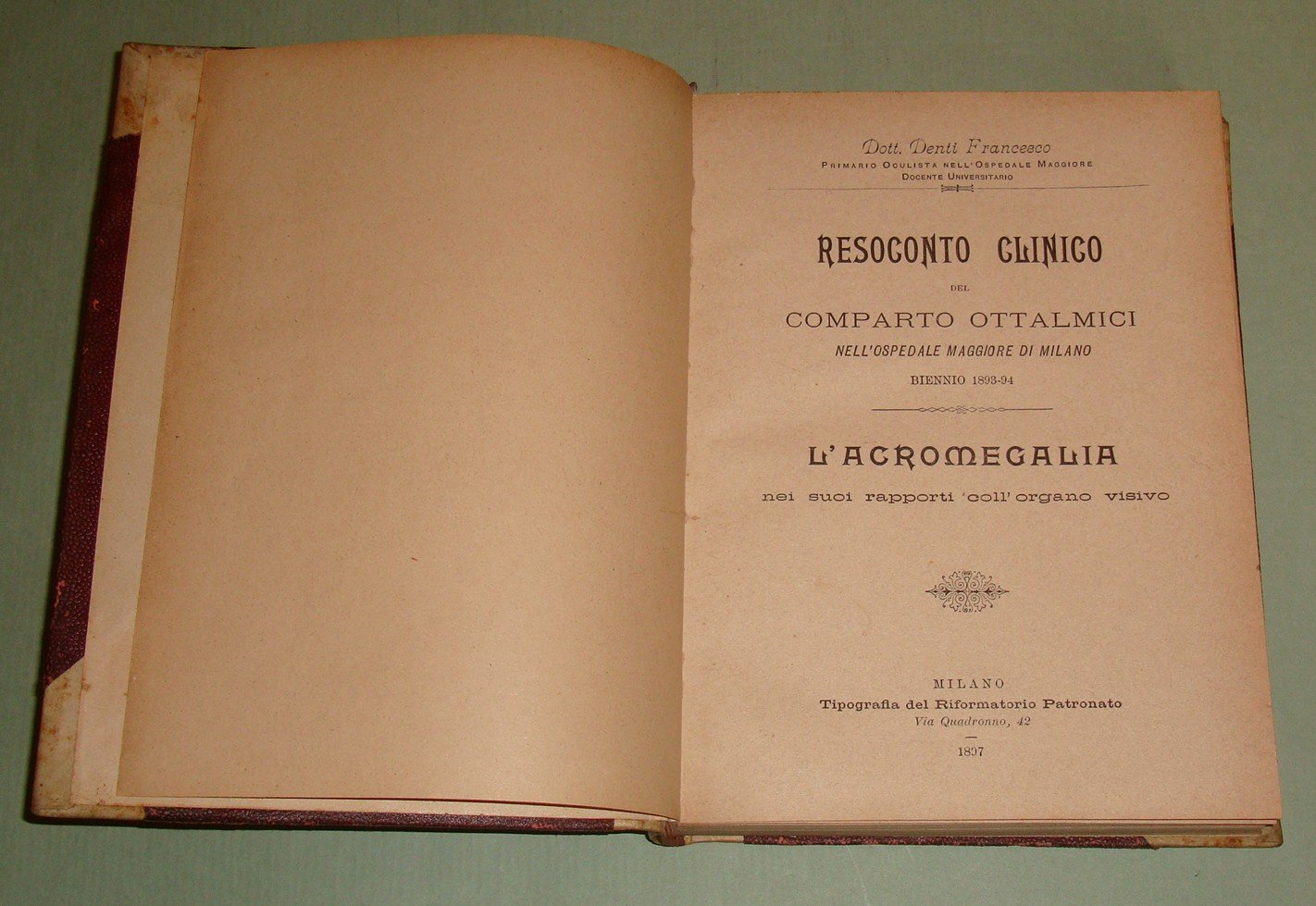 DENTI Francesco. Resoconto clinico del comparto ottalmici nell’ospedale Maggiore di Milano. Biennio 1893-1894. L’acromegalia nei suoi rapporti coll’organo visivo. Milano, 1897. In 16mo; pp.318. Illustrazioni. Mezza pergamena con angoli, titolo e fregi in nero al dorso.