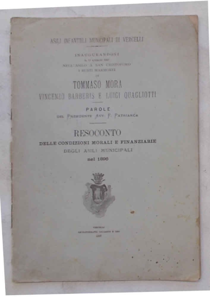 In 8° (cm. 23 x 15,5); pagg. 54; bross. originale con stemma al piatto. VG-. ** "Inaugurandosi il 17 luglio 1897 nell'asilo a San Cristoforo i busti marmorei di Tommaso Mora, Vincenzo Barberis e Luigi Quagliotti".