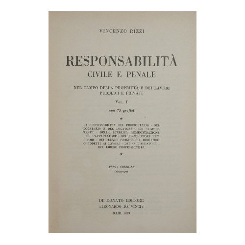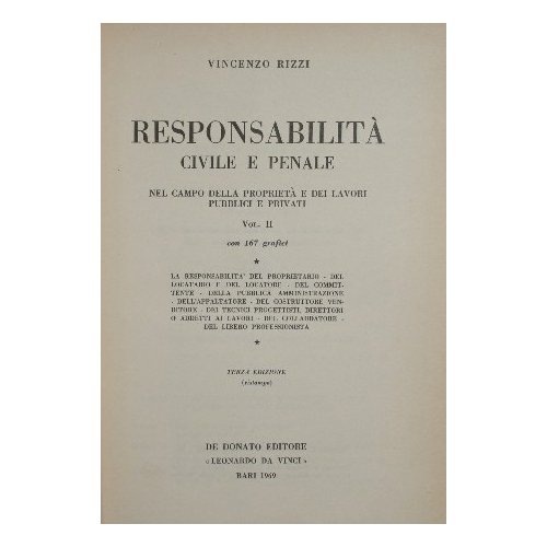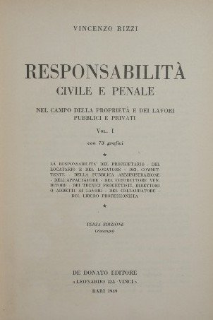 Vol. I: Con 73 grafici; Vol. II: Con 167 grafici - Terza edizione (ristampa) - in 8° - pp.XV + 541; XI + 727 - Tela con titolo in oro al piatto superiore e sovracopertina - Due volumi - Figure in b/n nel testo - Sovracopertine sporche - La responsabilità del proprietario. Del locatario e del locatore. Del committente. Della pubblica amministrazione. Dell'appaltatore. Del costruttore venditore. Dei tecnici progettisti, direttori o addetti ai lavori. Del collaudatore. Del libero professionista