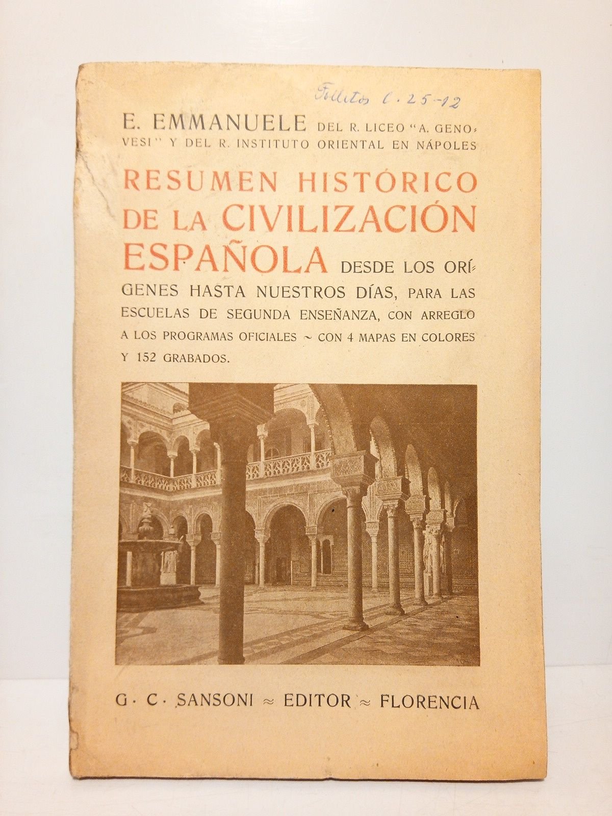 Florencia: G. C. Sansoni, 1931.- VIII,223,31 p.: Ilustraciones y un mapa plegado; 4º menor (20,1 x 13,4 cm); Rústica Ed.- MUY RARO.* Con una dedicatoria autógrafa del autor a Don Pedro Longás, en en la primera hoja de cortesía en blanco. La cabeza de la lomera ligeramente restaurada. Por lo demás en perfecto estado. HISTORIAS GENERALES DE ESPAÑA Y ENSAYOS SOBRE SU HISTORIA EN GENERAL