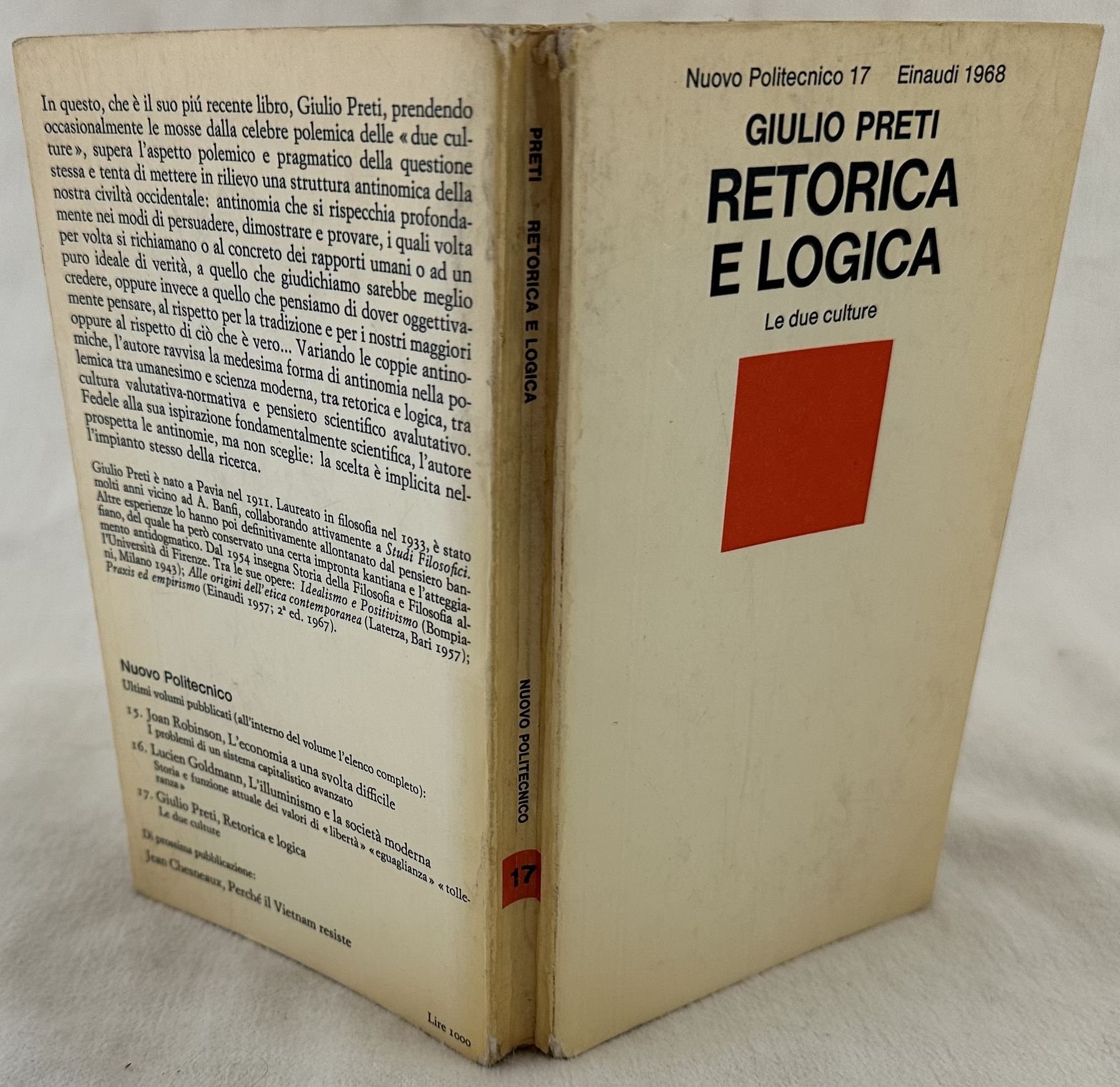 Edizione Einaudi del 1968 di questa monografia di retorica e logica di Giulio Preti. Firma al frontespizio. "In questo, che è il suo più recente libro, Giulio Preti, prendendo occasionalmente le mosse dalla celebre polemica delle "due culture" supera l'aspetto polemico e poragmatico della questione stessa e tenta di mettere in rilievo una struttura antinomica della nostra civiltà occidentalee: antinomia che si rispecchia profondamente nei modi di persuadere, dimostrare e provare, i quali volta per volta si richiamano o al concreto deiu rapporti umani o ad un puro ideale di verità.". In buone condizioni Copertina editoriale in buone condizioni generali con lievi usure ai margini e dorso. Macchie. Legatura in buone condizioni. All'interno le pagine si presentano in buone condizioni con rare fioriture. In 16. Dim. 18x10,5 cm. Pp. 242+(4).Einaudi edition of 1968 of this monography of rhetoric and logics by Giulio Preti. Signature in the title page. "In questo, che è il suo più recente libro, Giulio Preti, prendendo occasionalmente le mosse dalla celebre polemica delle "due culture" supera l'aspetto polemico e poragmatico della questione stessa e tenta di mettere in rilievo una struttura antinomica della nostra civiltà occidentalee: antinomia che si rispecchia profondamente nei modi di persuadere, dimostrare e provare, i quali volta per volta si richiamano o al concreto deiu rapporti umani o ad un puro ideale di verità.". In good conditions. Editorial cover in good conditions lightly worn in the extremities. Stains. Binding in good conditions. Inside pages are in good conditions with occasional foxing. In 16. Dim. 18x10,5 cm. Pp. 242+(4).<BR><BR>
