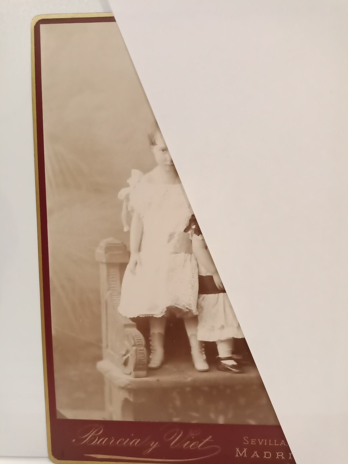 Madrid: Barcia y Viet, [ca. 1884].- 14,5 x 10 cm. en soporte de 16,5 x 10,5 cm.; color sepia en brillo.- Aparecen las niñas a la edad de cuatro y dos añitos respectivamente, ambas hijas de S. M. los reyes Don Alfonso XII y Dª María Cristina, están subidas en un banco y la entonces princesa de Asturias, María de las Mercedes, apoya su brazo sobre el hombro de su hermanita pequeña. Al pie del soporte el nombre del estudio fotográfico, así como en el verso en que aparece el anagrama y escudo.* POLÍTICA ESPAÑOLA DESDE 1833 A 1936